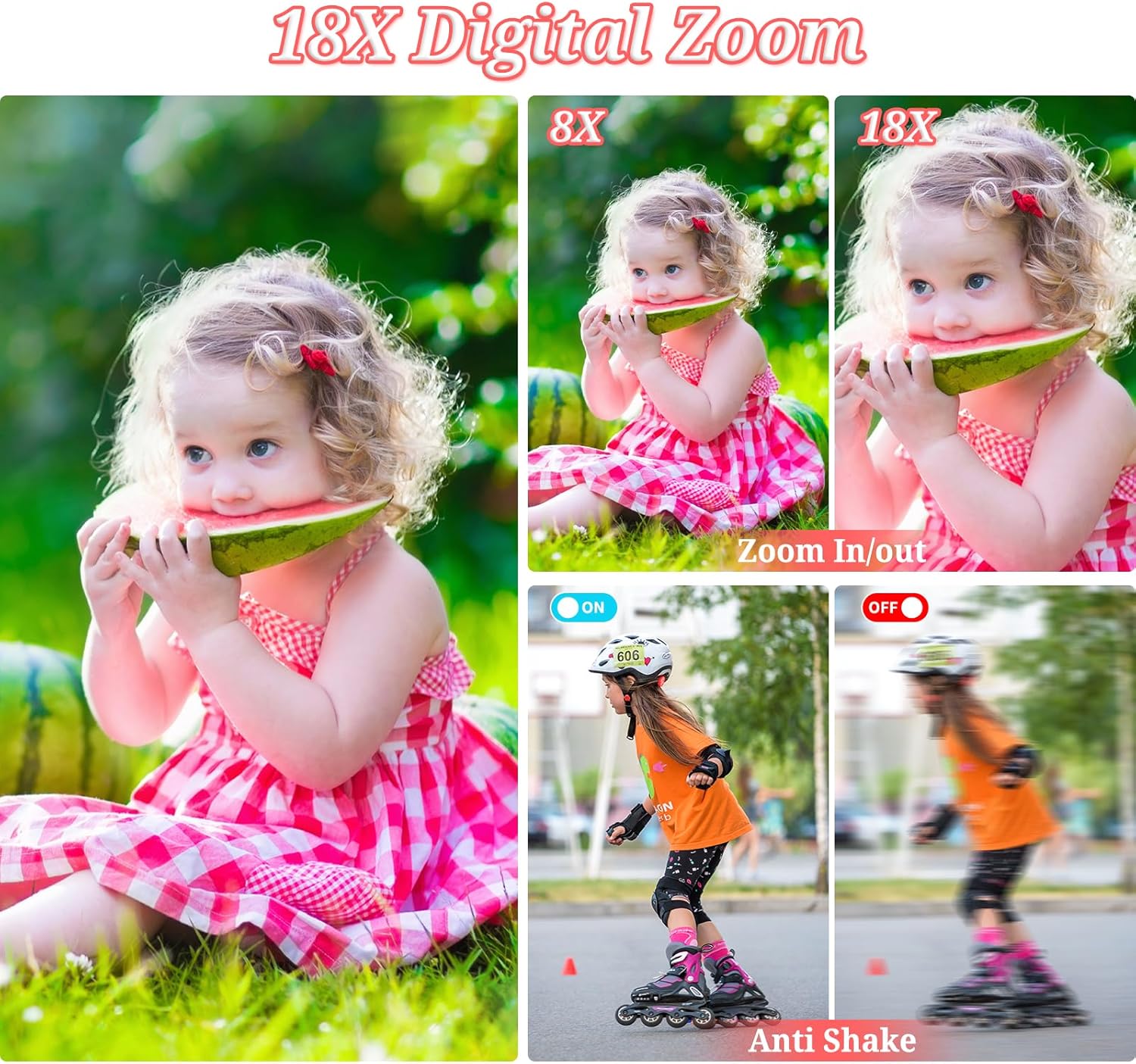 AUTO FOCUS&18X DIGITAL ZOOM- Customize your photos with the 18X zoom function, allowing you to capture objects in the distance with precision. Explore several creative filter effects, such as Vintage and Black/White, to add a unique touch to your pictures. With features like anti-shake, webcam, auto-focus, continuous shooting, and self-timer, the possibilities are endless