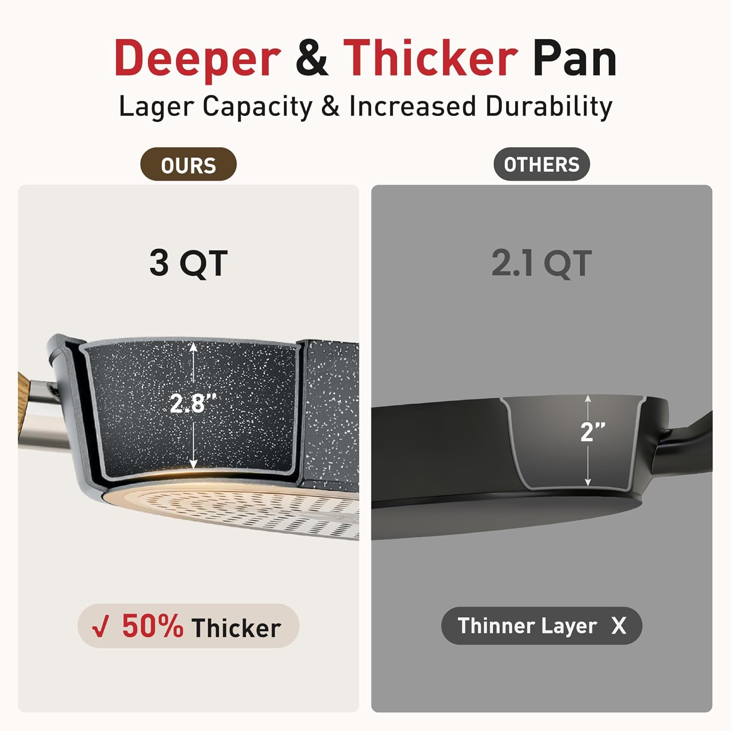 𝐓𝐡𝐨𝐮𝐠𝐡𝐭𝐟𝐮𝐥 𝐃𝐞𝐬𝐢𝐠𝐧 𝐟𝐨𝐫 𝐏𝐫𝐚𝐜𝐭𝐢𝐜𝐚𝐥𝐢𝐭𝐲: Anti-scald handles keep your hands safe, while the deeper pan shape allows for versatile cooking techniques, from stir-frying to simmering. Versatile kitchen cookware sets for various cooking methods