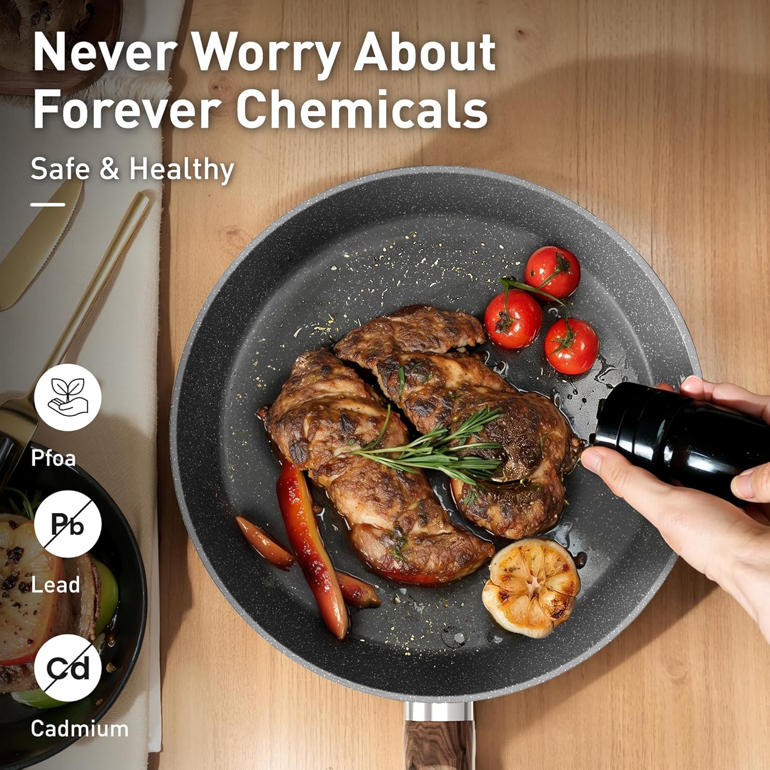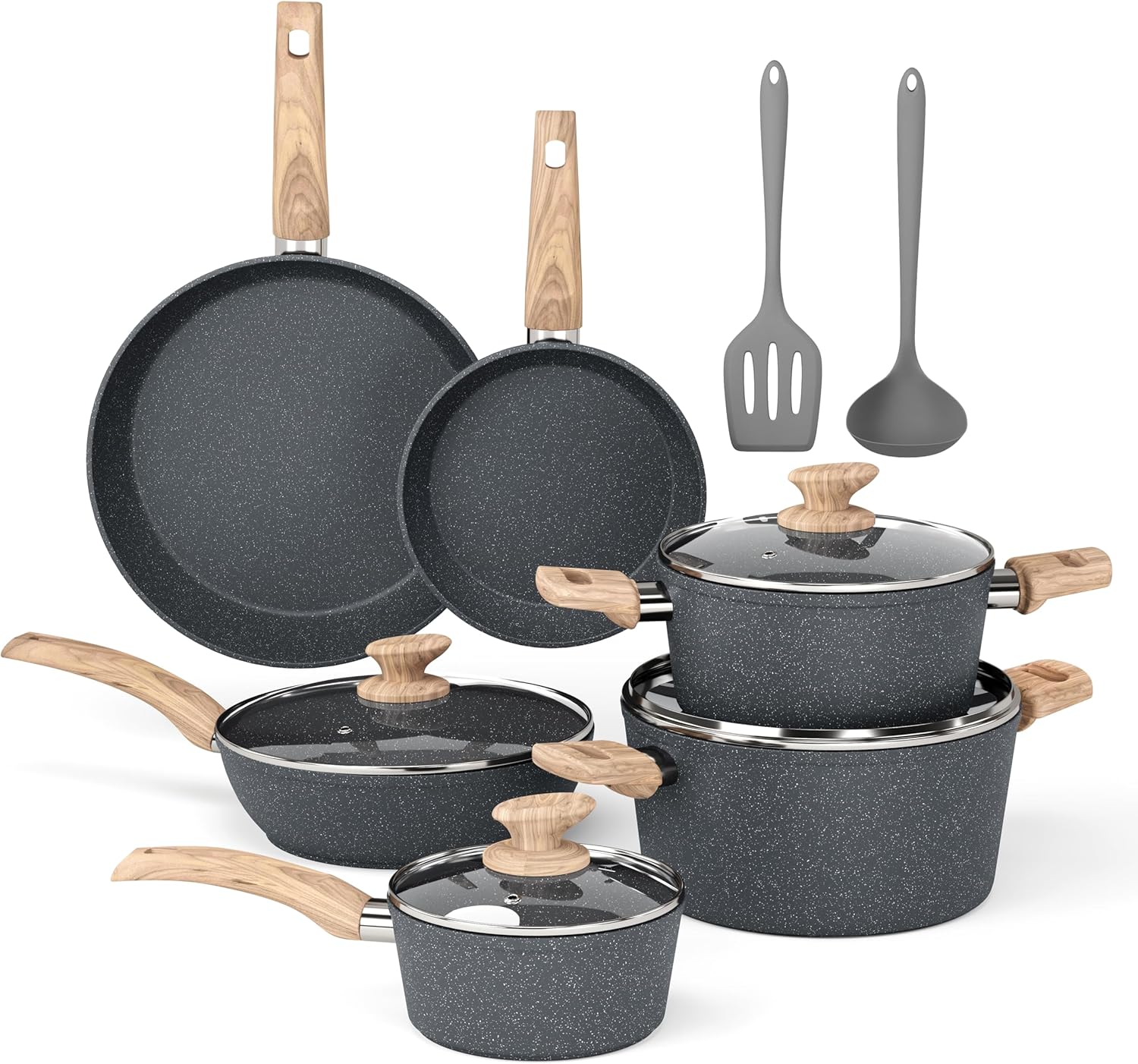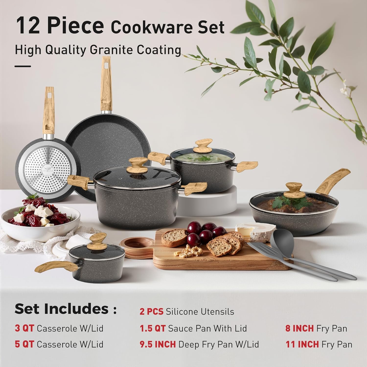 𝟏𝟐 𝐏𝐢𝐞𝐜𝐞 𝐆𝐫𝐚𝐧𝐢𝐭𝐞 𝐂𝐨𝐨𝐤𝐰𝐚𝐫𝐞 𝐒𝐞𝐭 𝐈𝐧𝐜𝐥𝐮𝐝𝐞𝐬: 8-inch fry pan / 11-inch fry pan / 9.7-inch Deep Fry Pan with lid / 1.5Q saucepan with lid / 3Q casserole with lid / 5Q casserole with lid / 2 pcs silicone utensils. Different size of non stick pots and pans set meets all your need for daily cooking