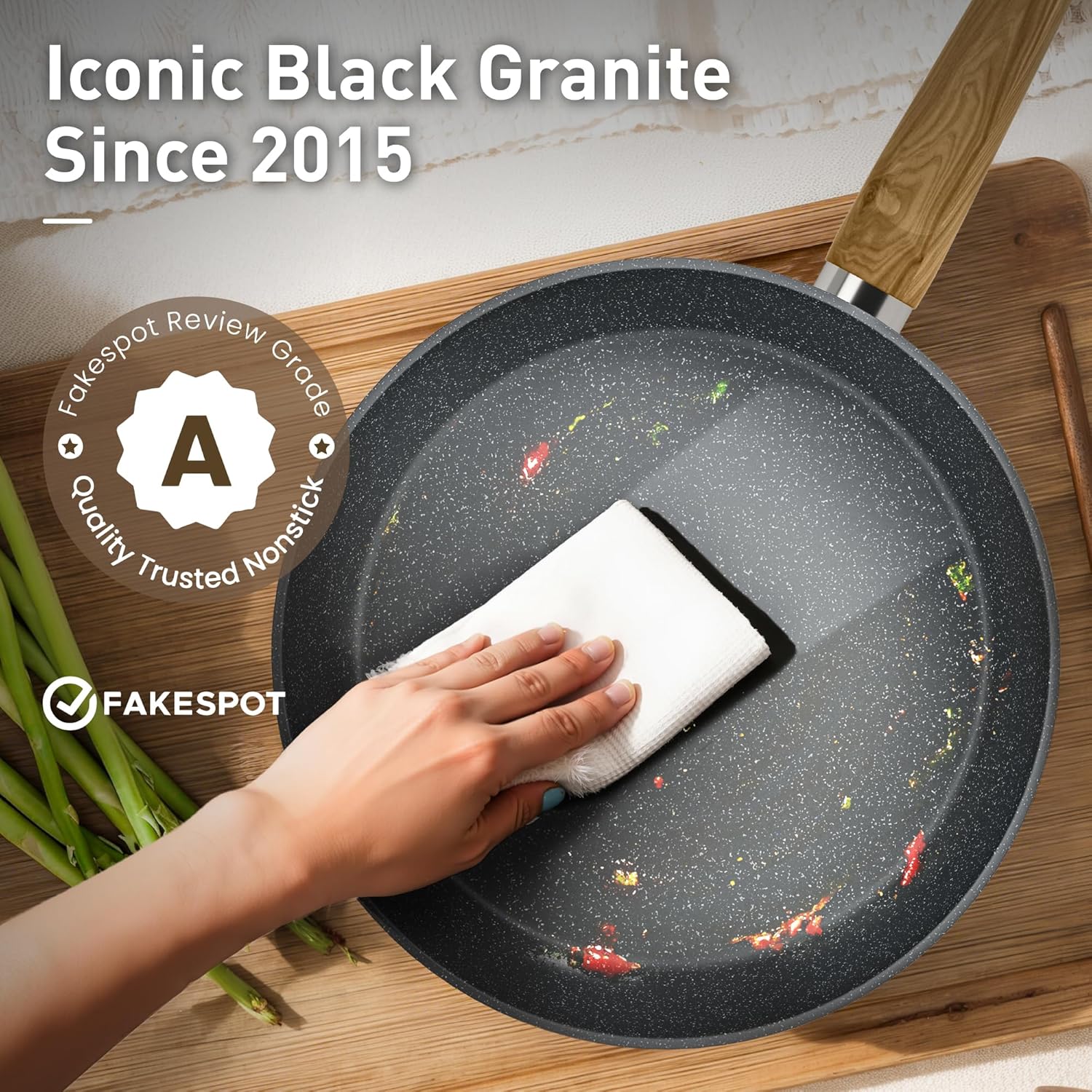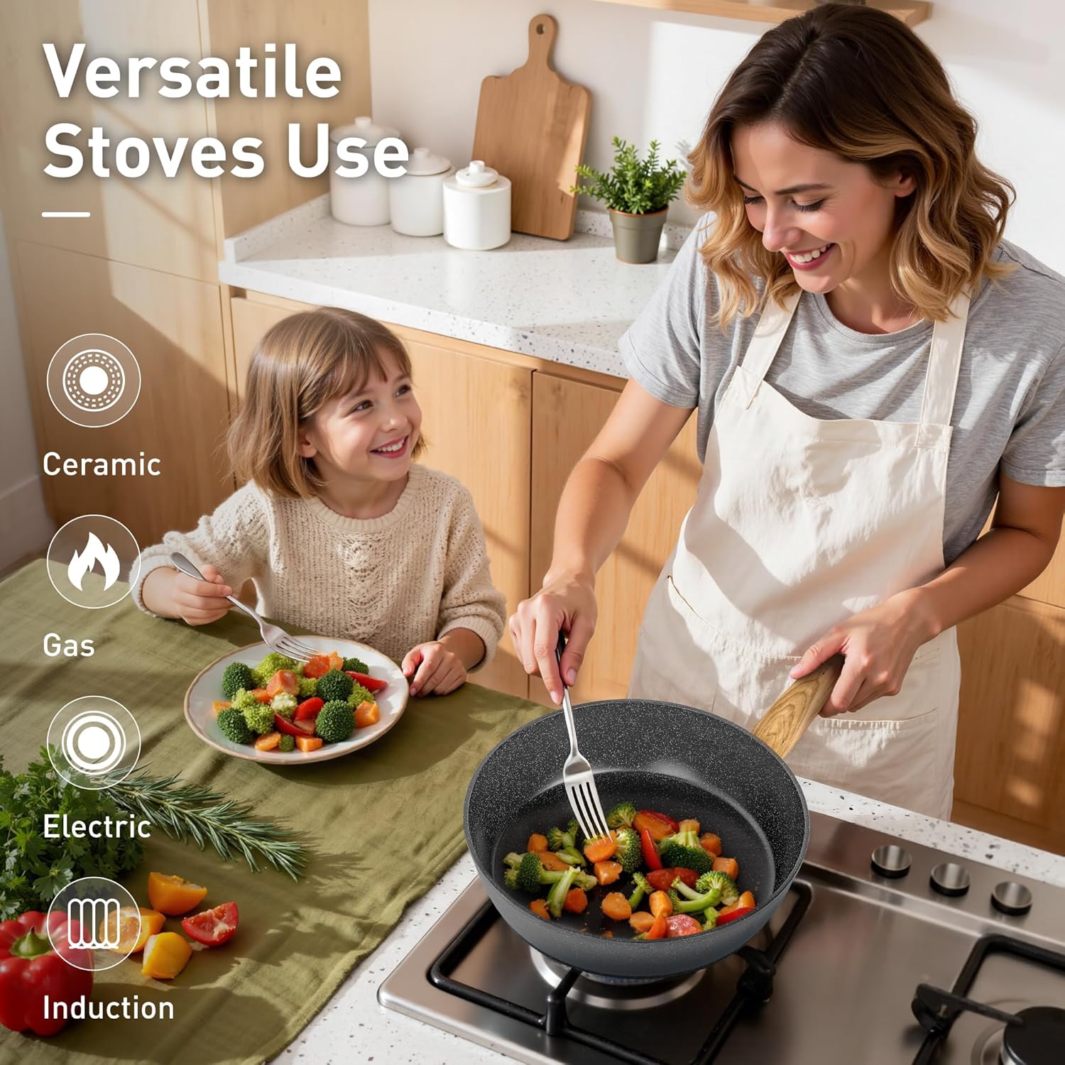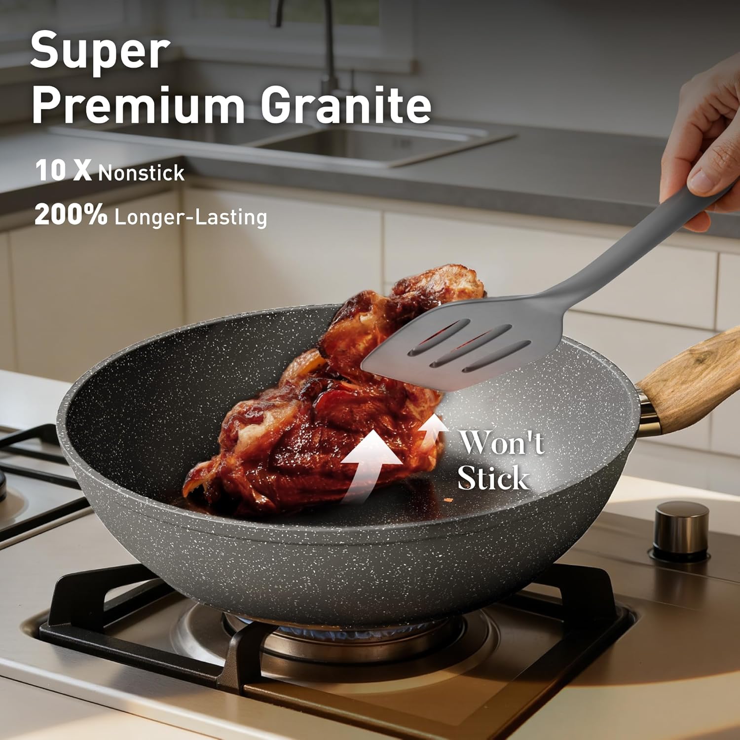 𝐍𝐨𝐧𝐬𝐭𝐢𝐜𝐤 𝐆𝐫𝐚𝐧𝐢𝐭𝐞 𝐏𝐨𝐭𝐬 𝐚𝐧𝐝 𝐏𝐚𝐧𝐬 𝐒𝐞𝐭: The non-stick material allows light oil and less fumes, and the pan set is wear-resistant and lightweight, which enhances the experience of stir-fry cooking and makes cooking healthier