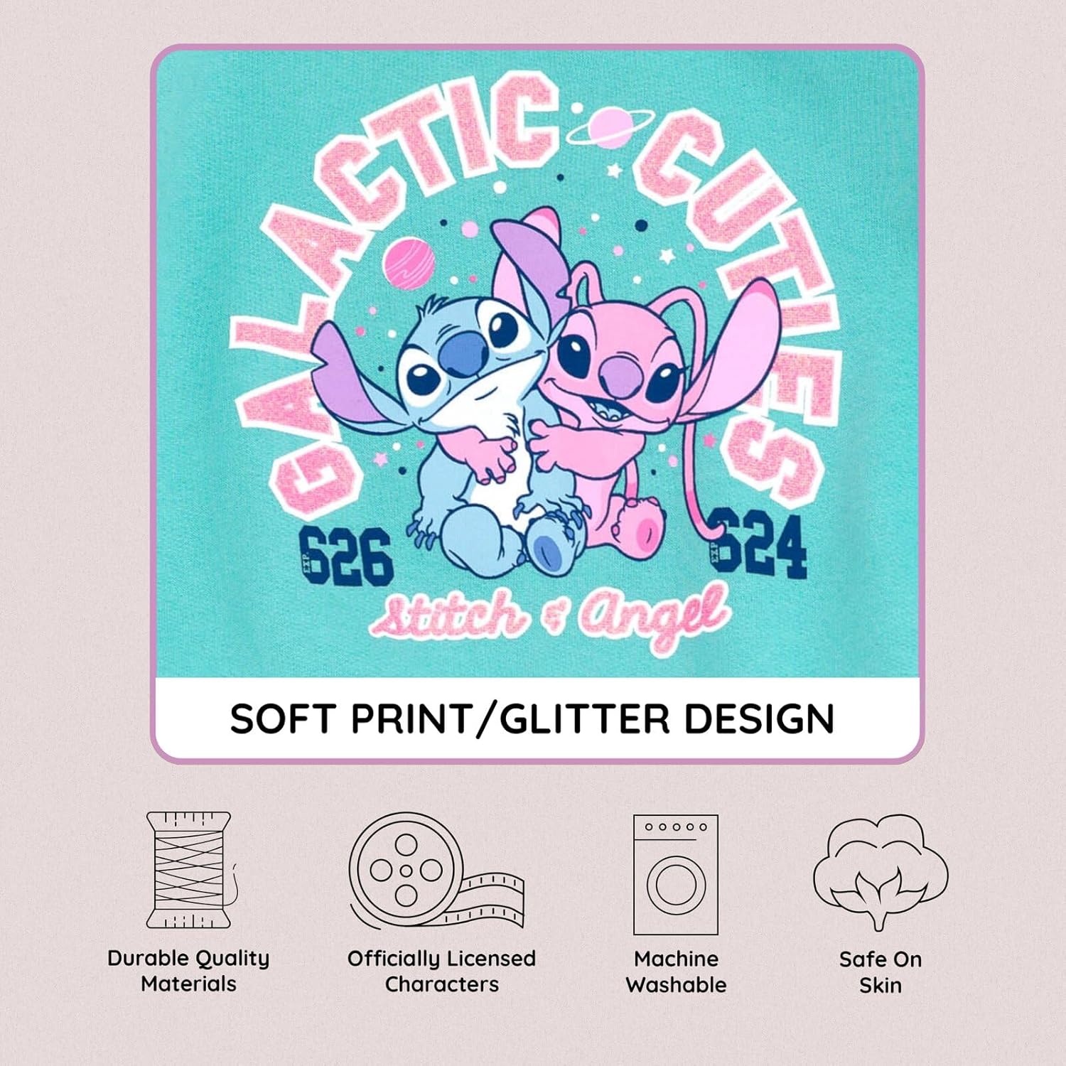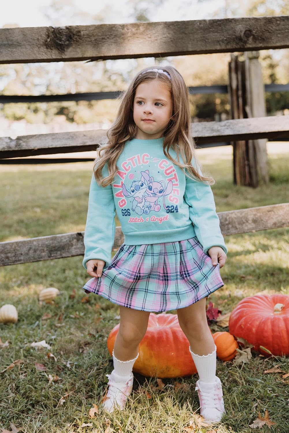 Cute pack of 2 soft short sleeve t-shirts featuring graphic art of the adorable Stitch that are perfect for those sunny summer days. Soft blue hoodie with cute artwork of everyone’s favorite koala resembling alien and a fashionable crossover design. Keeps your little girl warm and cozy. Cool short sleeve button down Hawaiian print shirt with pictures of Stitch in various fun poses. Can be dressed up or dressed down. Colorful short sleeve tee with stylish side ties featuring Stitch holding a glittery gold heart in front of rainbow artwork with the words “Love More.” Stylish purple and blue dress with pretty ruffle sleeves and a tulle skirt. Features your little girl’s favorite blue alien in a glittery tropical design.