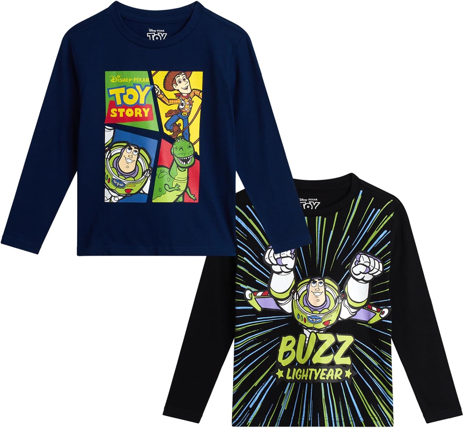 Bring Pixar magic to his everyday wardrobe with this Disney Toy Story boys shirts 2 pack, featuring officially licensed graphics of Buzz Lightyear, Woody, and Rex. Designed for toddlers and kids ages 2T–7, this set includes a mix of long sleeve boys shirts and short sleeve boys graphic tees, offering versatile Toy Story style for year-round wear. Each shirt showcases beloved Toy Story characters kids instantly recognize. Buzz Lightyear appears in bold space ranger designs with iconic suit details and confident action poses, making these Buzz Lightyear shirts for boys perfect for little fans who love space adventures. Woody, the brave sheriff, is featured with classic cowboy styling that brings western charm and friendly hero energy to these Woody shirts for boys. Select designs also include Rex, Toy Story’s lovable dinosaur, adding playful personality and fun character appeal kids adore. Crafted from soft, comfortable fabric, these Toy Story boys graphic tees are made for all-day wear, whether at school, playtime, or relaxing at home. The short sleeve boys shirts are ideal for warm weather and active days, while the long sleeve boys shirts provide added coverage for cooler temperatures and easy layering. Both styles offer a comfortable fit that supports movement and everyday comfort. Perfect for mixing and matching with jeans, joggers, or shorts, these Toy Story shirts for boys deliver durable construction and standout Disney character style. With two unique Toy Story designs in one convenient pack, this set is a must-have for fans of Buzz Lightyear, Woody, and Rex, making it ideal for everyday outfits, casual wear, or gifting.