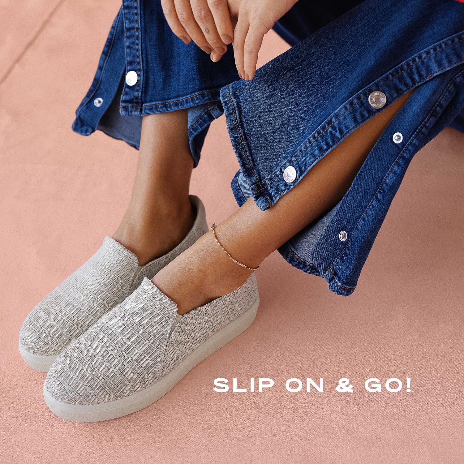 Sky’s the limit in these ultra-comfy slip on sneakers for women. SUSTAINABLY CRAFTED: Fabric lining and topcloth partially made from recycled plastic bottles; partially recycled toe box and heel counter. MATERIALS: Sustainable canvas fabric upper or microfiber partially made from recycled plastic bottles. FIT: Slip on fit for easy on/off. FEELS: Anti-odor, anti-microbial Insole Technology with anatomical cushioning, comfort, & support. MOVEMENT: Lightweight, flexible construction moves with you. STYLE: Womens slip ons with round toe, simple twin gore, and lightweight, flexible 1 inch sport sole. CONSCIOUSLY PACKAGED: This style is shipped in an environmentally preferred 1-piece box made with primarily recycled materials that can be recycled & soy-based inks. Our fan fave slip ons level up. Lightweight, flexible walking shoes that you’ll wear as airport shoes, comfort shoes, or everyday shoes.