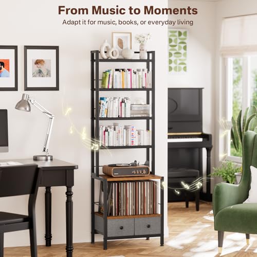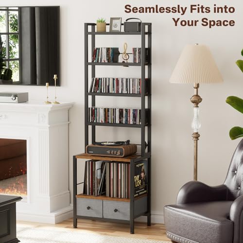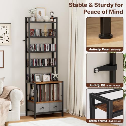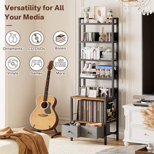 DVD Storage Vinyl Record Storage Rack, 6-Tier CD Rack Tower with Drawers for CDs, DVDs, Albums, Books & Games, Vinyl Record Holder & DVD Shelf Organizer for Living Room & Home Office, 20.8×11.8x63Inch