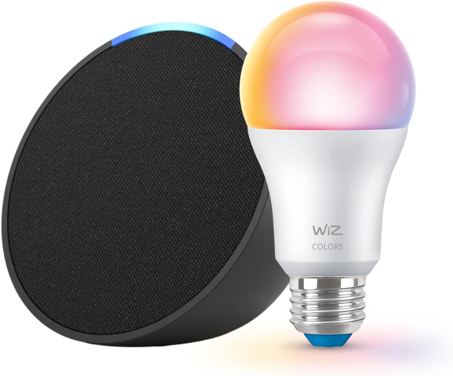 Echo Pop (newest model) with WiZ 60W A19 LED Smart Color Bulb – Connects to Your Wi-Fi – E26 Base – Control with Voice or App – Matter Compatible