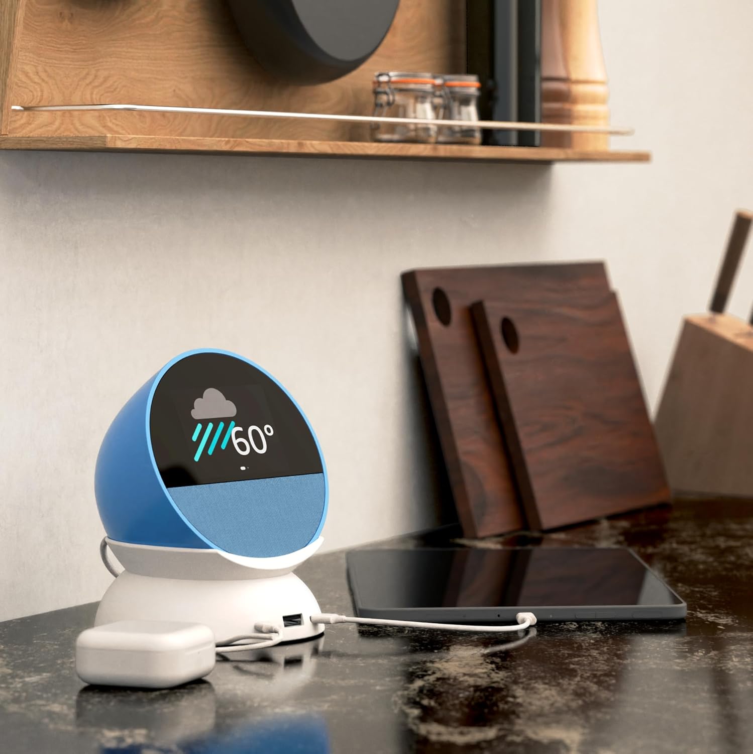 Echo Spot Bundle: Includes Echo Spot | Ocean Blue & Made for Amazon Stand with USB-C and USB-A Charging Ports | Glacier White