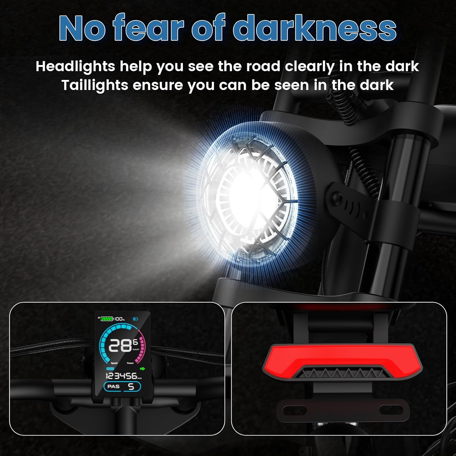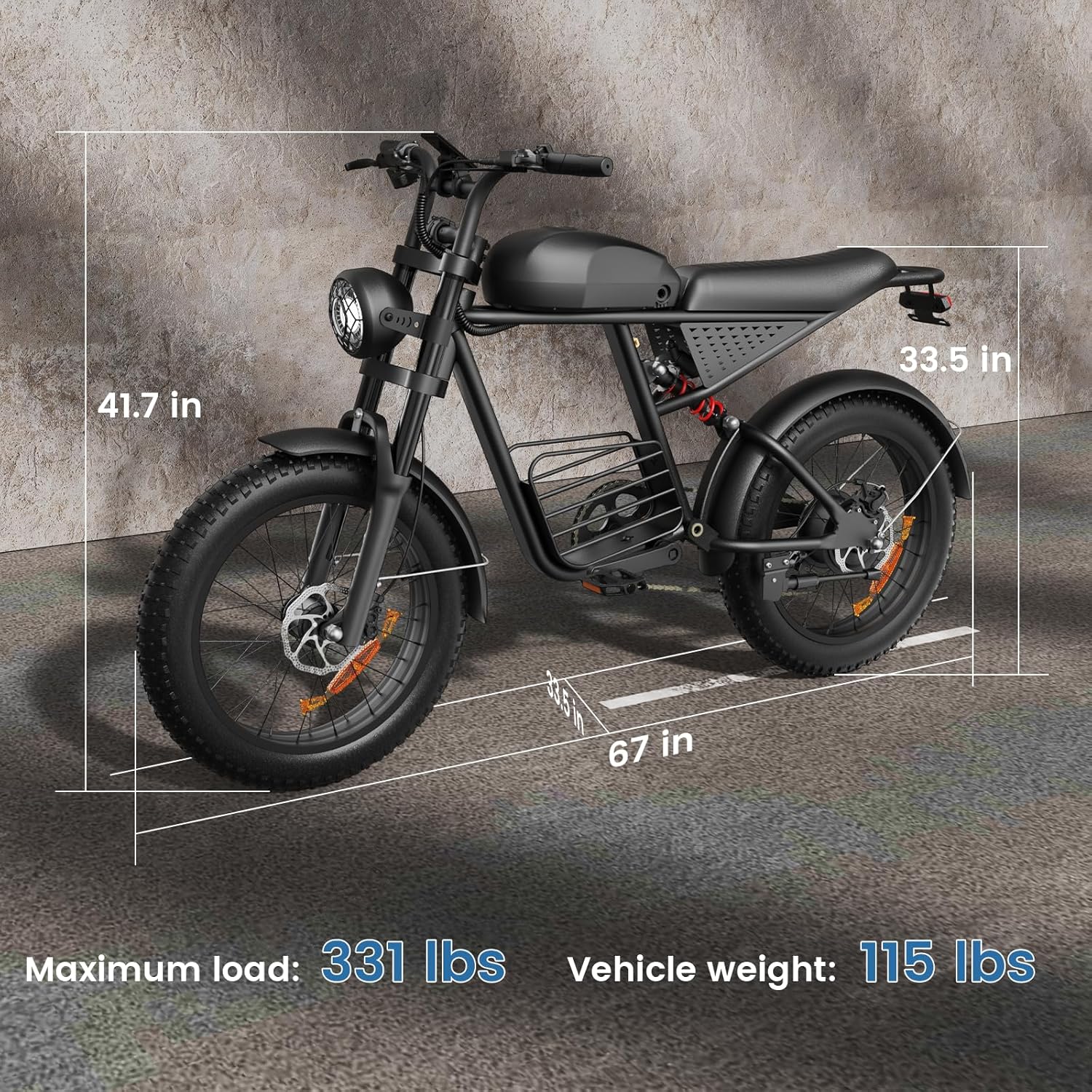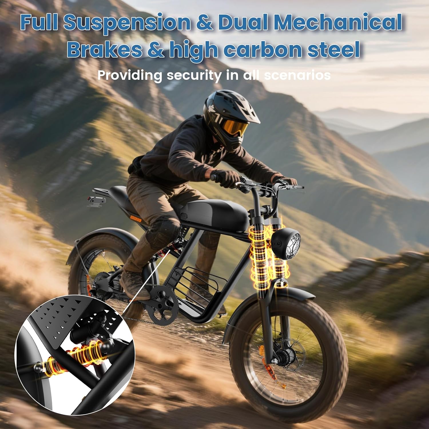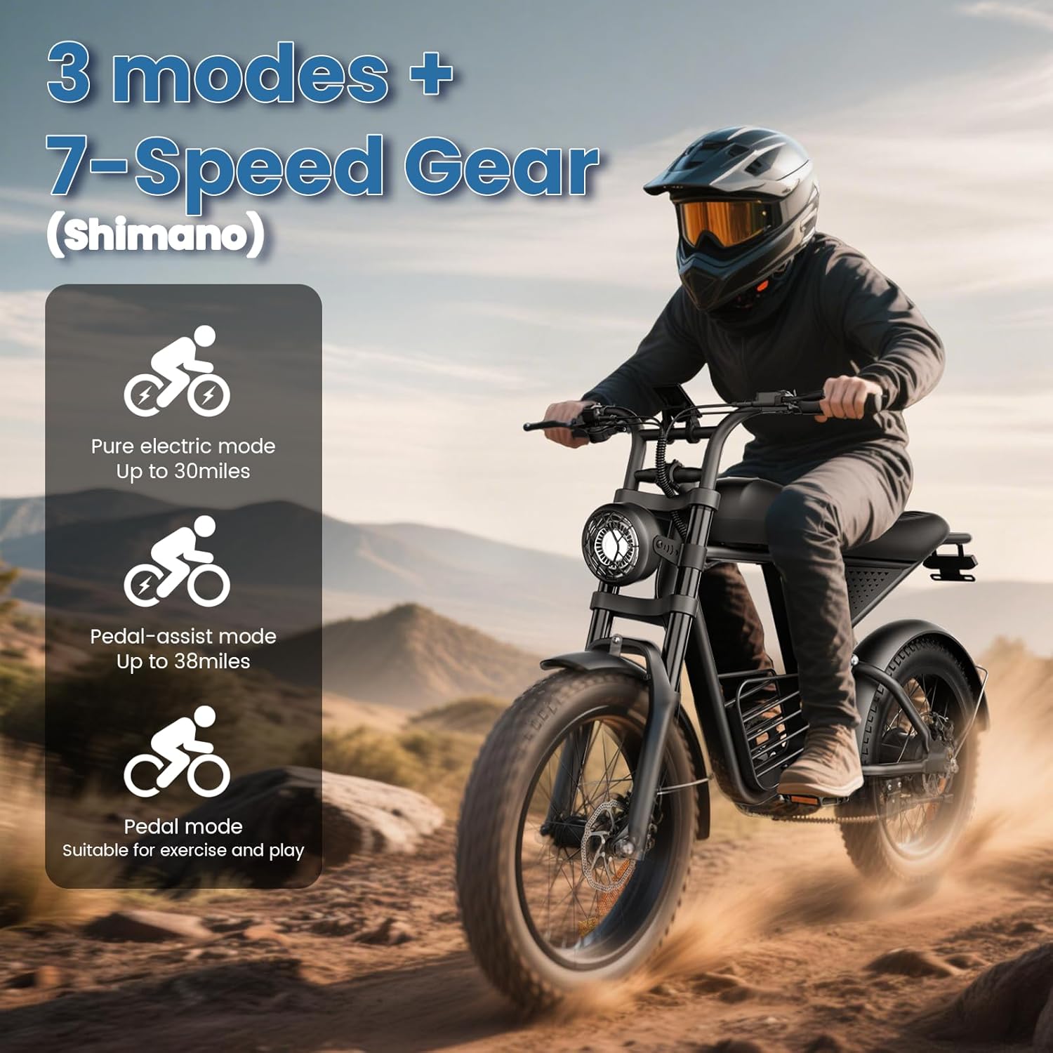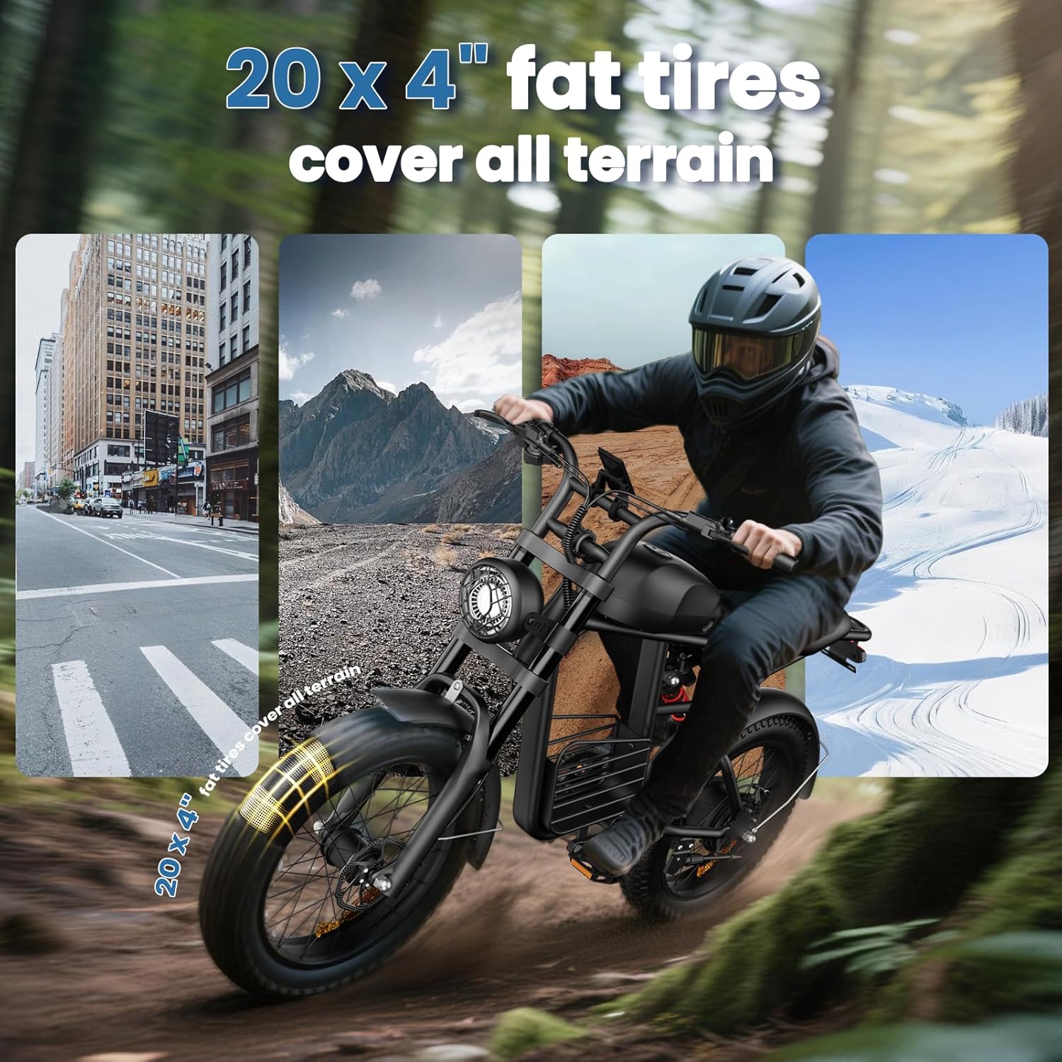 The 20″ fat tires provide superior grip and stability on mountains, snow, sand, dirt, and paved roads, giving you full control and comfort across all terrains.
