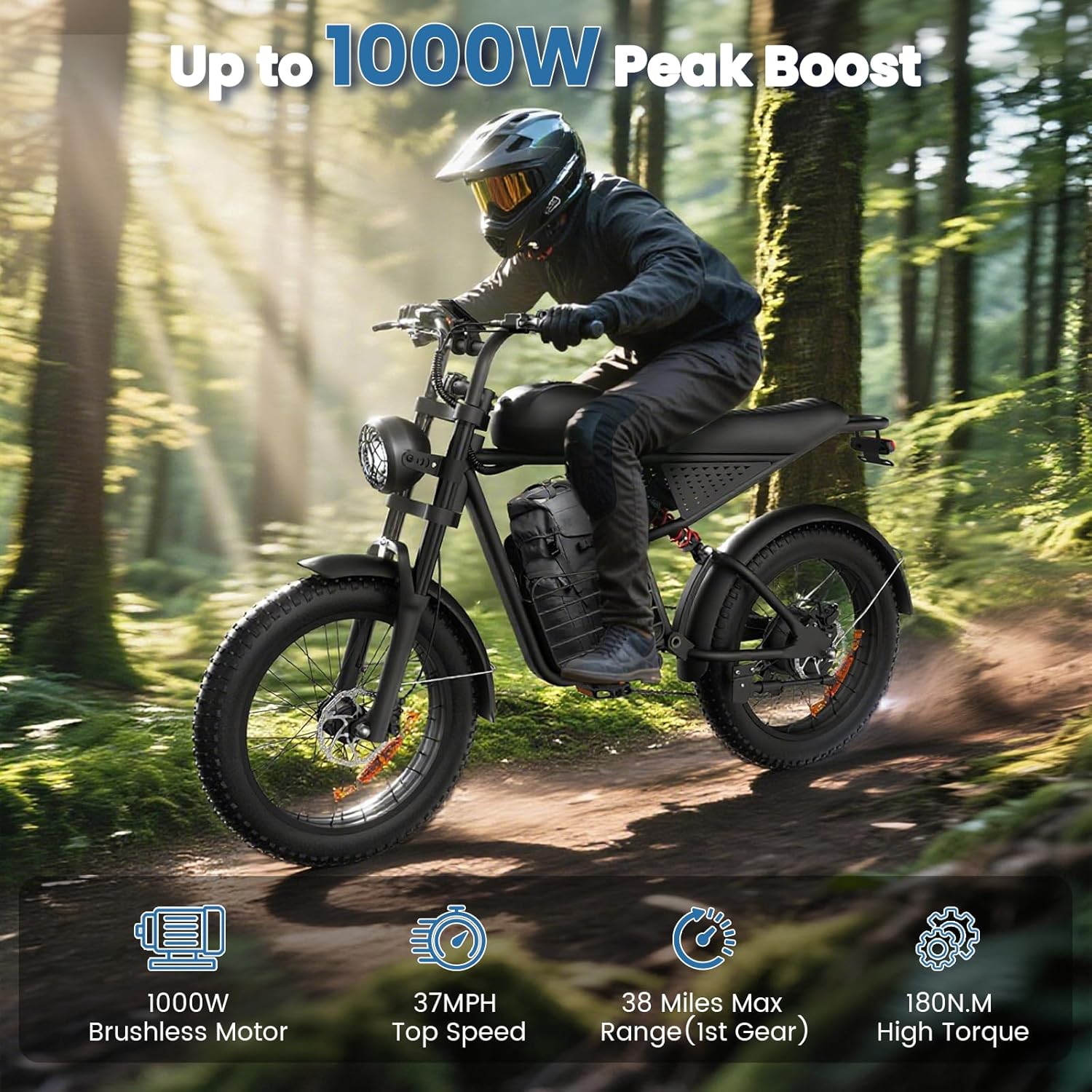 1000W Peak high-performance motor delivers instant torque and powerful acceleration, reaching up to 32MPH, making every ride exciting whether you’re commuting or riding off-road.