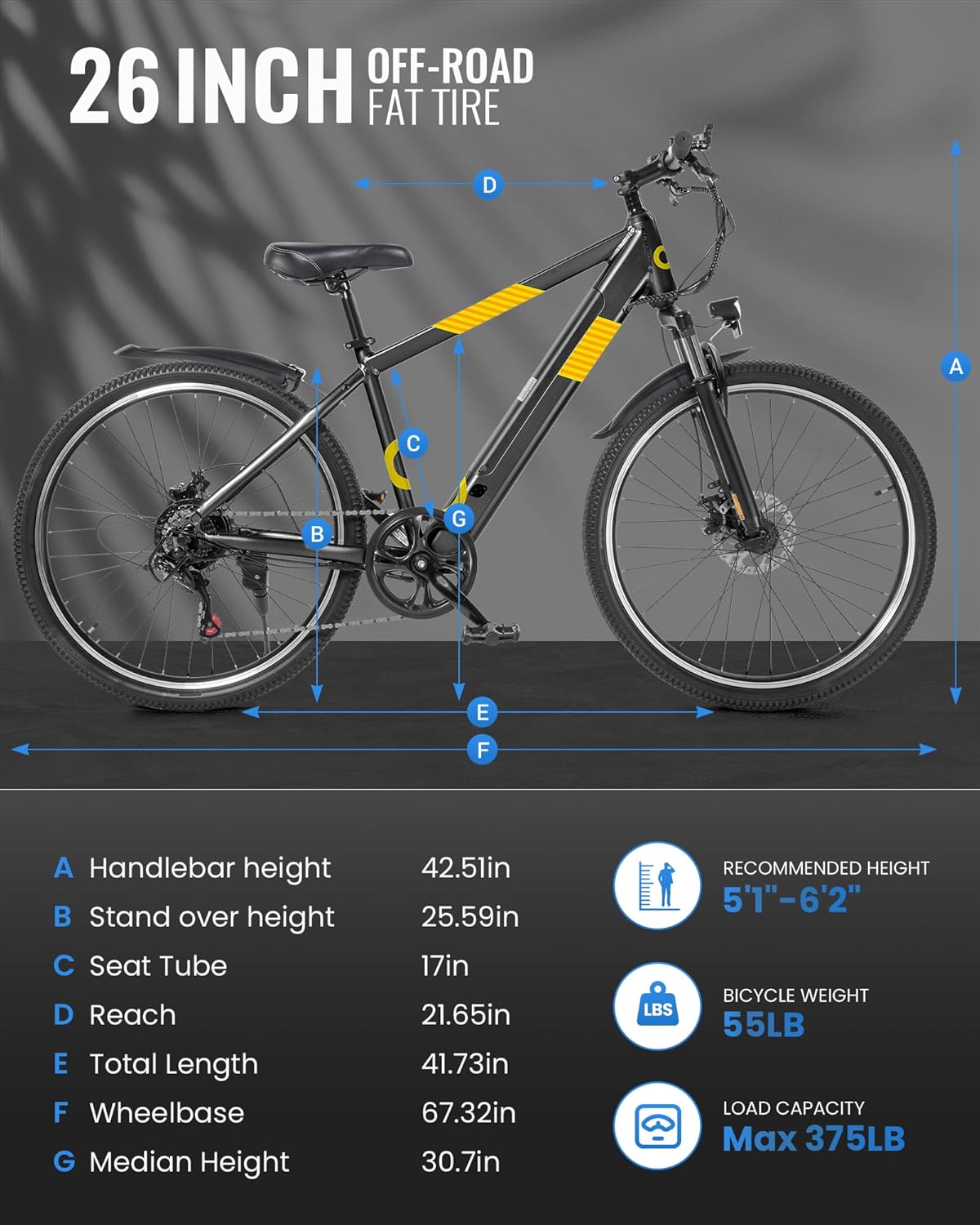 Comfort & Safety That Adapts to You:Ride in comfort,no matter the terrain. The 26″ puncture-resistant tires laugh off rough roads,while the lockable front fork suspension smooths out bumps and shocks. With 21-speed gears,you can dial in your perfect pace,and dual fenders keep mud/water off your clothes. Front and rear mechanical disc brakes deliver quick,reliable stops,and our UL2849 certification means every electronic component meets strict safety standards. Ride easy,ride safe.