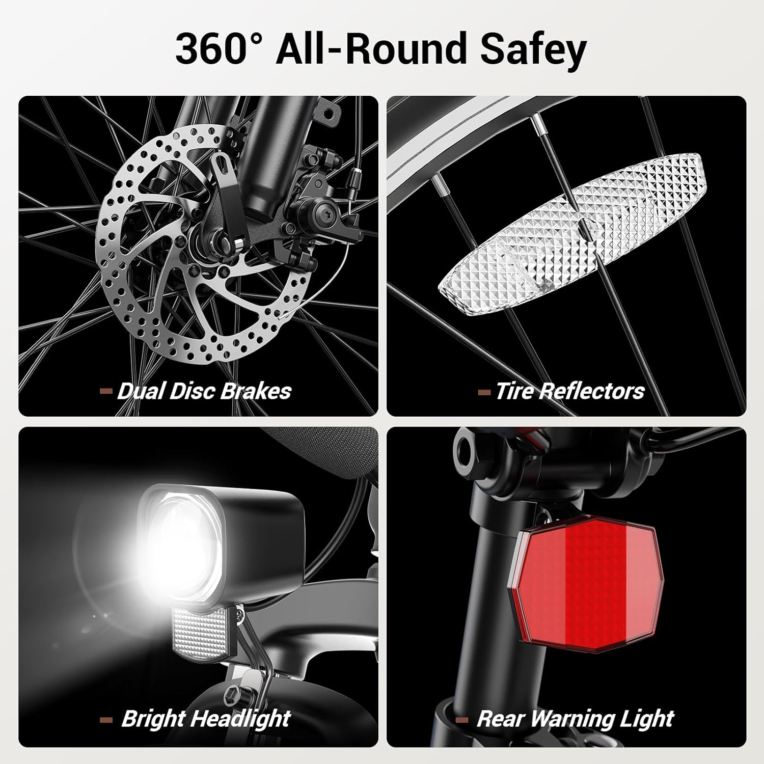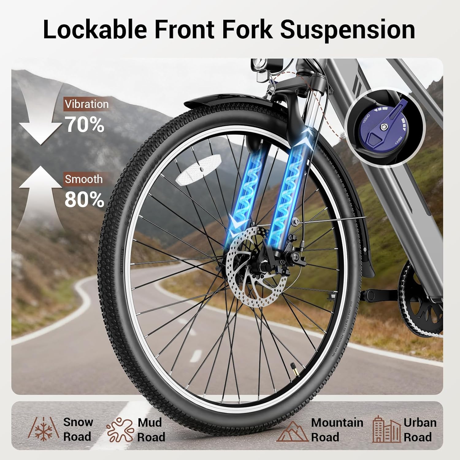 🛡️【All-Terrain 26″ Front Suspension Ebike】- Experience unstoppable grip and comfort! The 26″×2″ tires and front suspension system allow this electric bike to excel on snow, sand, trails, and wet roads. Dual disc brakes provide reliable stopping power and safety in all conditions.