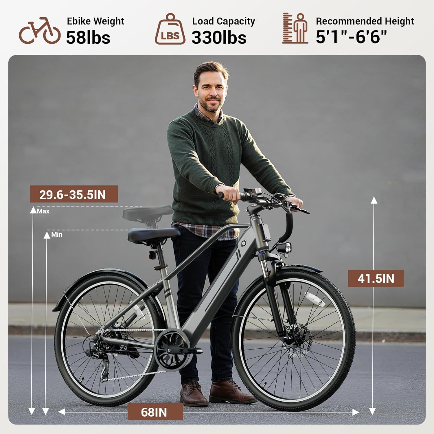 🌎【Ergonomic Design Ebike for Adults】- Built for all-day riding comfort! The Yoloway YC1 e bike supports riders up to 265 lbs and features comfortable saddle and handlebar for a perfect fit. Full fenders add protection from splashes, making every ride—whether commute or adventure—clean and exhilarating.