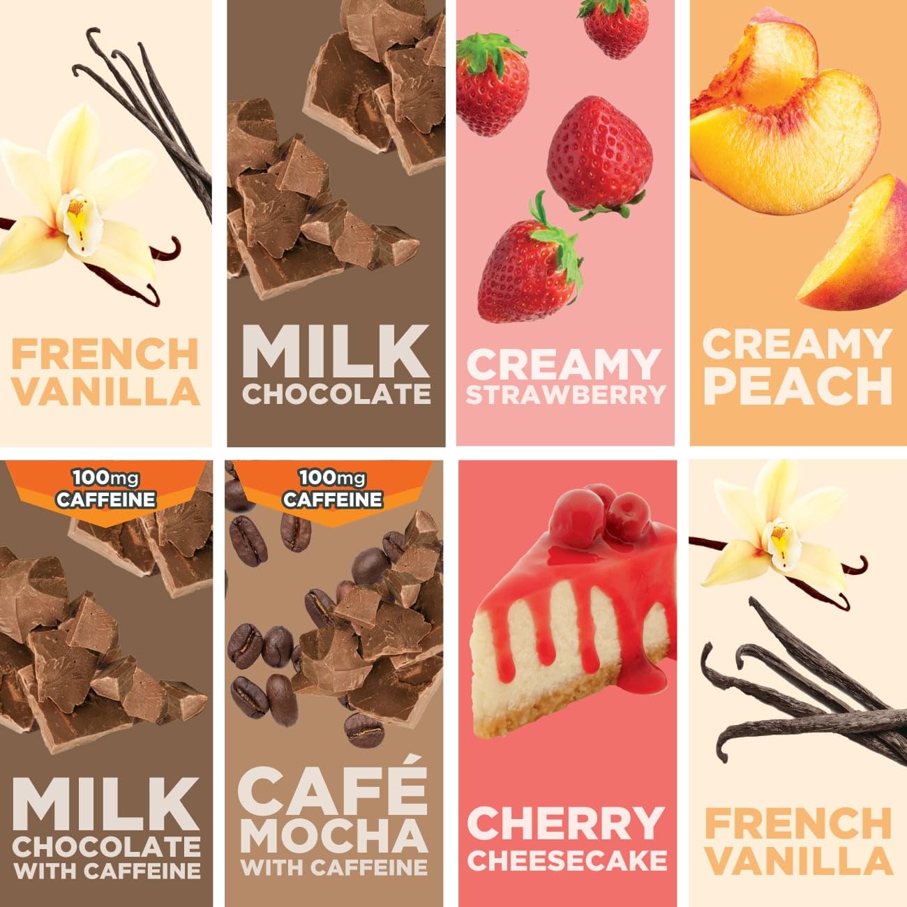 Ensure Max Protein variety pack lets you taste all 7 delicious flavors to find your favorites: Milk Chocolate with caffeine, Café Mocha, Milk Chocolate, Creamy Strawberry, Creamy Peach, Cherry Cheesecake, and French Vanilla. Each flavor in this shake variety pack has 30g of high-quality protein to help keep muscles strong and satisfy hunger. Ensure Max Protein also has 1g of sugar, 150 calories, plus 25 essential vitamins and minerals, including vitamins A and D, zinc, and antioxidants (vitamins C & E and selenium) to support immune health. From Ensure, the #1 doctor-recommended brand.* This product is gluten-free and suitable for lactose intolerance.† * Among doctors who recommend liquid nutritional products to their patients. † Not for people with galactosemia.