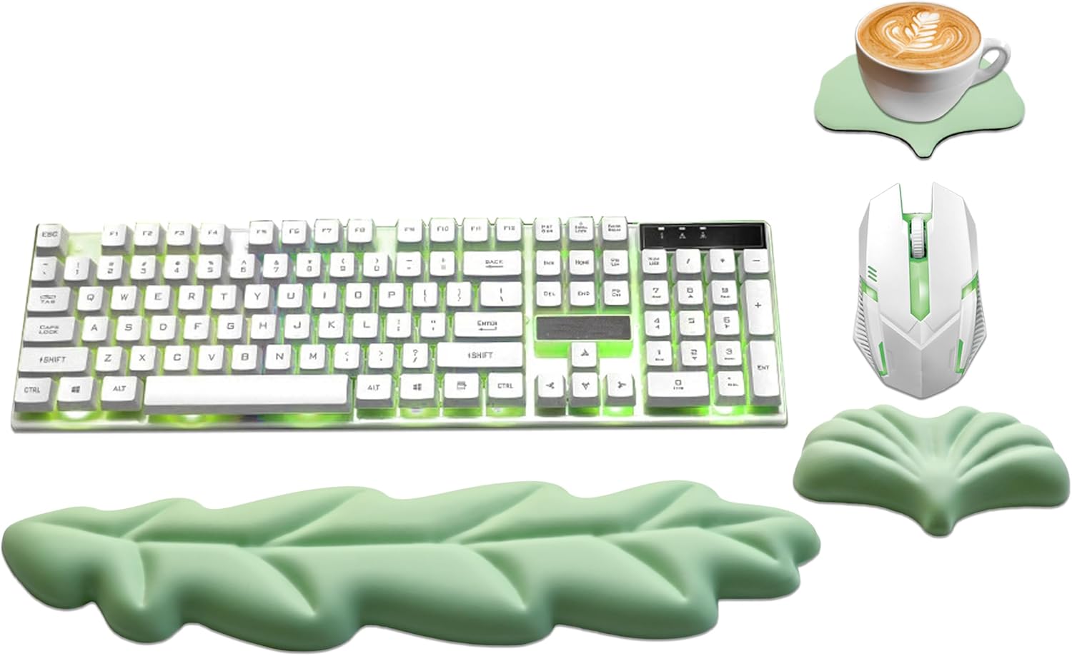 【LEAT COMPUTER ACCESSORIES】Including 1 cute keyboard leaf wrist rest (16.7×4.1” ), 1 mouse leaf wrist support (5.9×3.7”) and 1 cup coaster (4.7×3.9”). The perfect gaming desk accessories for home office and school