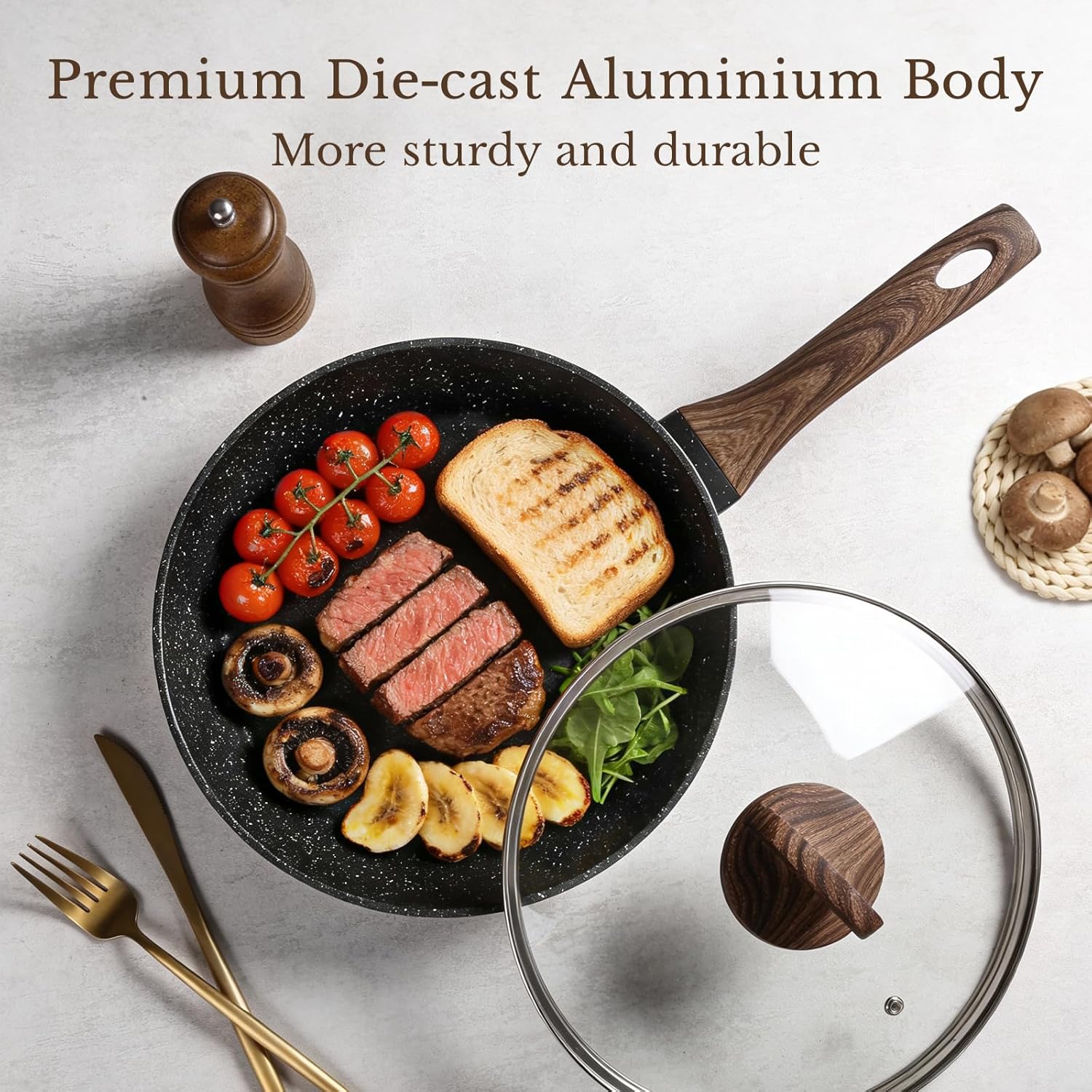 HEALTHY GRANITE NON-STICK COATING: Superior granite coating for smooth, ultra-non-stick cooking; food slides off effortlessly without sticking. Free of PTFE, PFAS, PFOA, PFOS, APEO, lead, cadmium and other toxic substances that can leach into food.