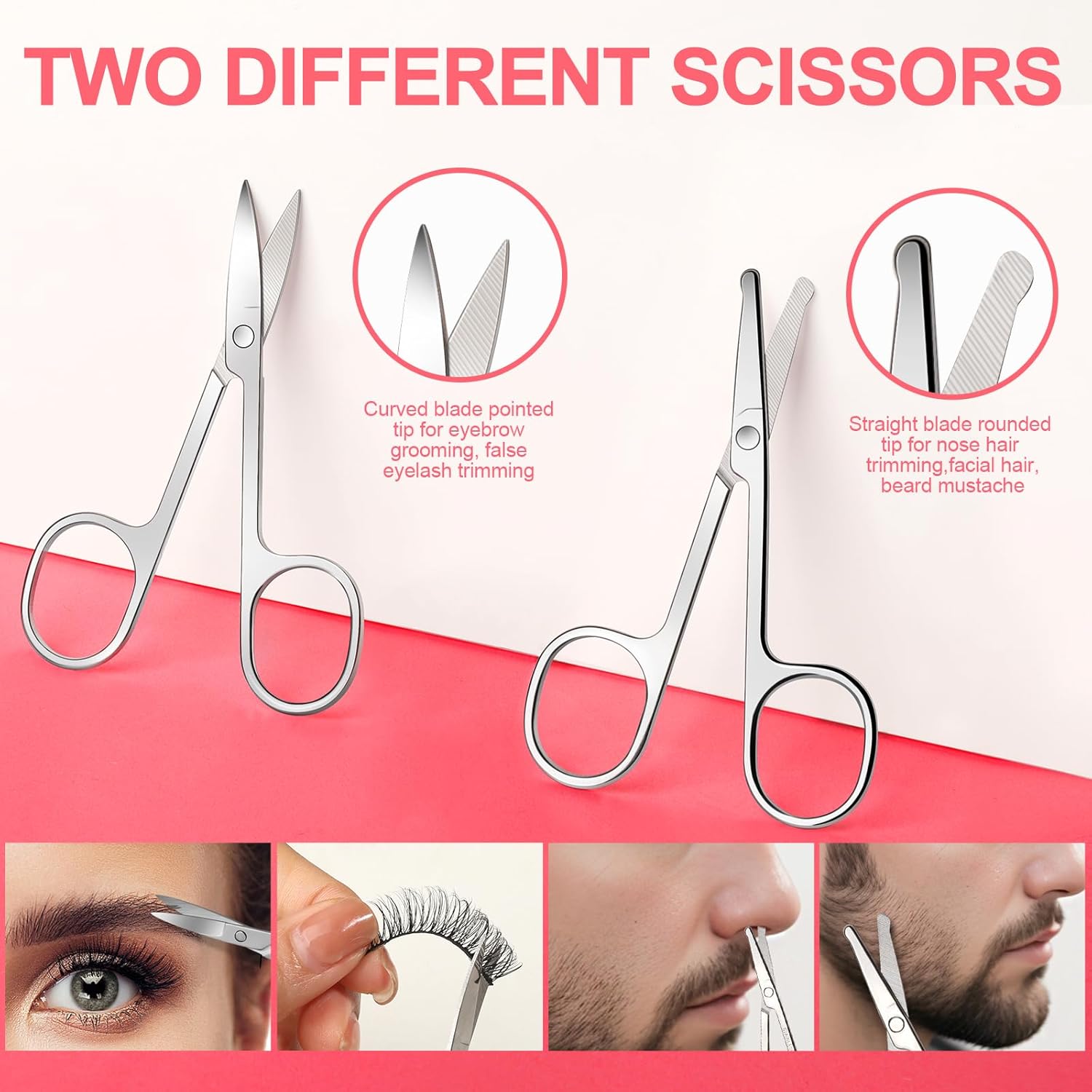 Eyebrow Scissors for Men Women: The curved blade pointed tip scissors used for eyebrow grooming, false eyelash trimming and the straight blade rounded tip for scissors for nose hair trimming, facial hair, beard mustache. Rounded tip design will not hurt your skin, ideal for ingrown hair removal. The nose hair scissors are made of high grade stainless steel, easy to use and not easy to break.