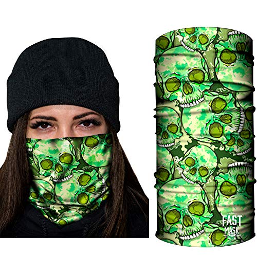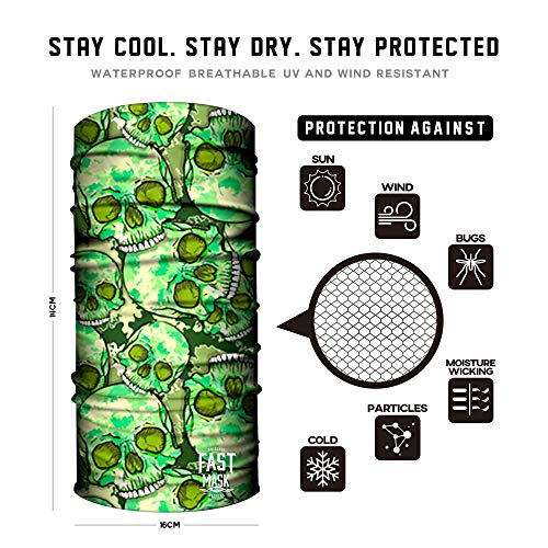 Fast Mask Tubular Face Mask, Tubular Bandana Green Skulls Design, Breathable Fabric, 100% Polyester Microfiber Face Protection with SPF 40 for Men and Women