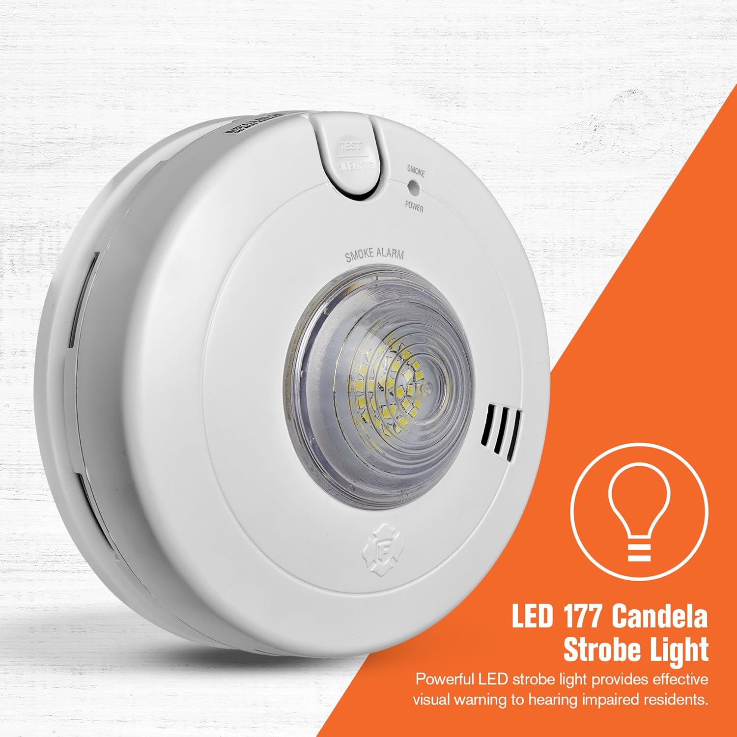 Integrated smoke alarm and strobe light in one device. Powerful LED strobe light provides effective visual warning for hearing impaired residents.