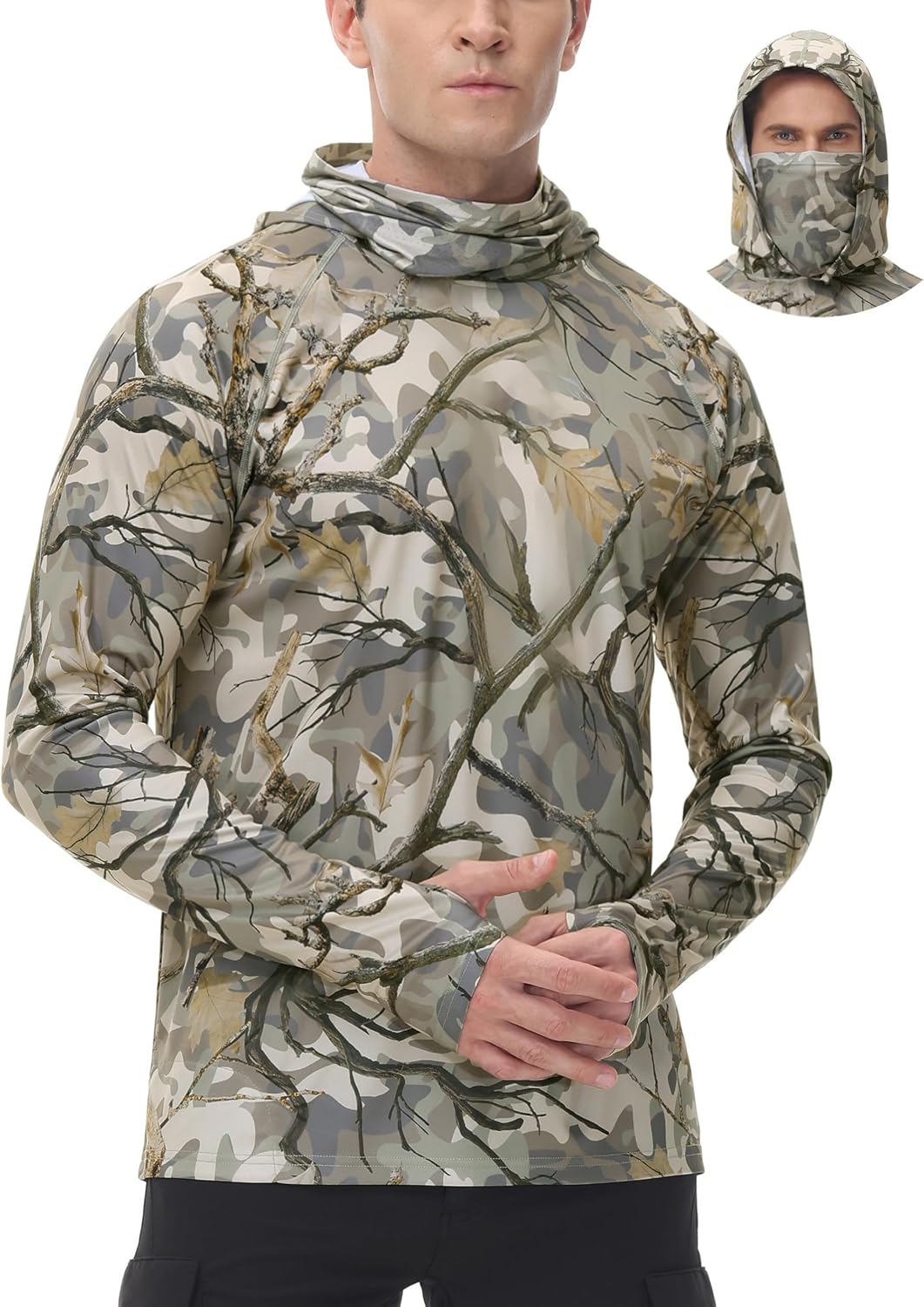 FISHEAL Men’s Hunting Shirts with Mask – UPF 50+ Camo Long Sleeve Fishing Hoodie Shirt with Adjustable Drawstring
