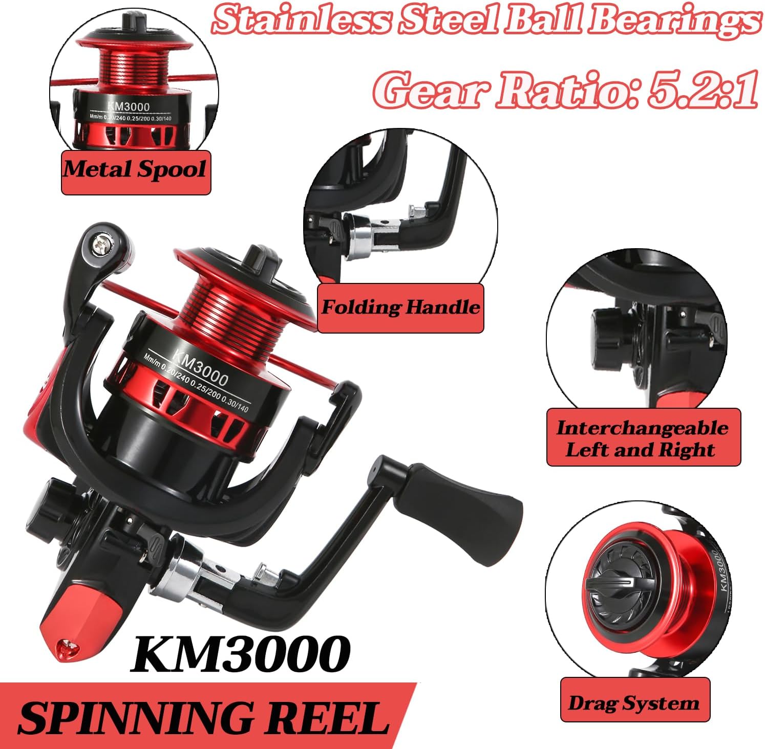 【2 x KM3000 Spinning Reels】These spinning fishing reels feature a powerful aluminum spool and a folding design, metal handle. The reel handles can be exchanged to accommodate different user habits.