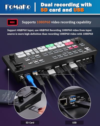 【Versatile Multi-port Support】4xHDMI input ports and features 5 channels video sources output choose from 4xHDMI+AUX(USB flash or SD card palyback),NDI HX source ,1 HDMI PGM Output ports and 3 Video Output source choose from HDMI PGM,USB 3.1 (Type-C) and AUX.The PGM can overlay up to 8 layers,delivering powerful and flexible switching capabilities for professional live productions.