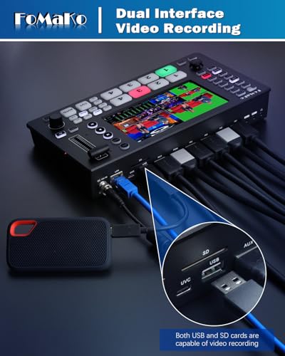 【High Definition 5.5 Inch Screen】FoMaKo 4K HDMI Video Mixer Switcher with 5.5-inch Integrated Monitoring Display,which can directly view multi-screen signals and flexible menu operations.The 5.5-inch LCD screen provides real-time monitoring directly on the switcher. This integrated resolution ensures immediate visual feedback.
