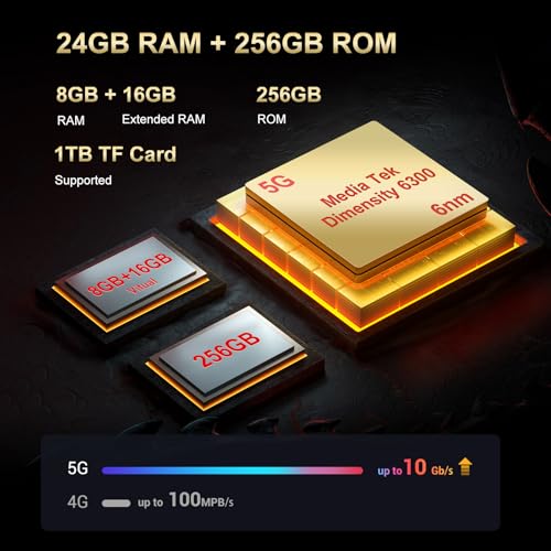 Global 5G Network Dimensity 6300+Octa-Core Chipset:The FOSSIBOT F112 Pro 2.4 GHz high-frequency 5G rugged smartphone features an octa-core Dimensity 6300 processor and utilizes an efficient 6nm advanced manufacturing process to avoid latency, crashes, or overheating issues. Experience blazing-fast speeds and effortless multitasking in high-intensity gaming, smooth streaming, and everything in between. With 24GB RAM (8GB + 16GB virtual RAM) and 256GB ROM(1TB extended), it allows for smooth simultaneous operation of multiple memory-intensive applications and provides ample storage space.