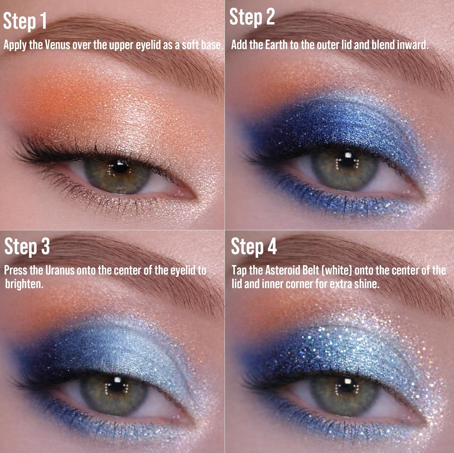 Discover a Unique space-inspired eyeshadow palette! Featuring the Sun, Moon, Earth, Mercury, Venus, Mars, Jupiter, Saturn, Uranus, and Neptune — each shade is packed with richly pigmented metallic and shimmer eyeshadows. The frosty asteroid belt offers four chunky glitter eyeshadow tones swirled together for a dazzling intergalactic finish.