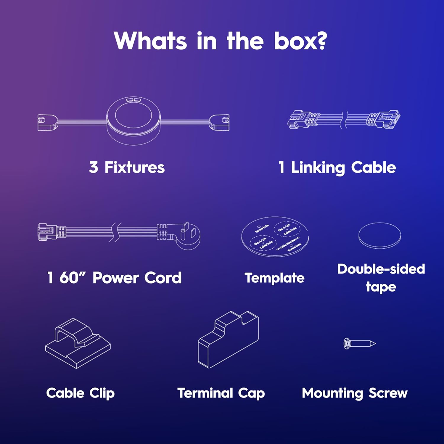What’s Included: Three (3) 3-inch puck fixture lights, power cord, linking cable, mounting accessories, reference template