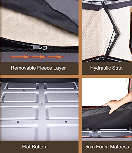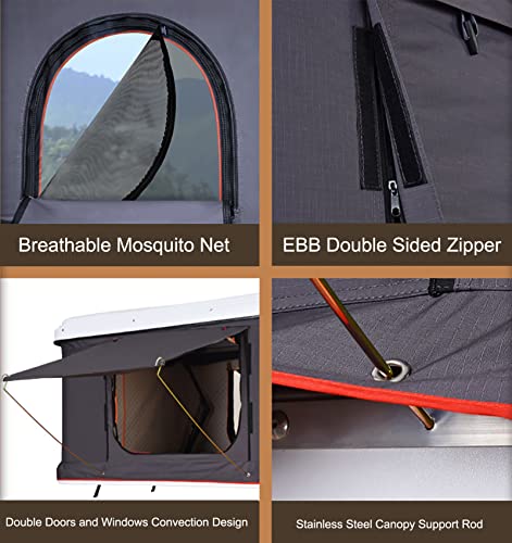 HARD SHELL ROOF TENT: The roof tent is made of durable ABS hard shell and special Oxford with PU waterproof coating, plus a reinforced aluminum alloy /ABS base to resist strong storms and rain, giving you more safety camping experience