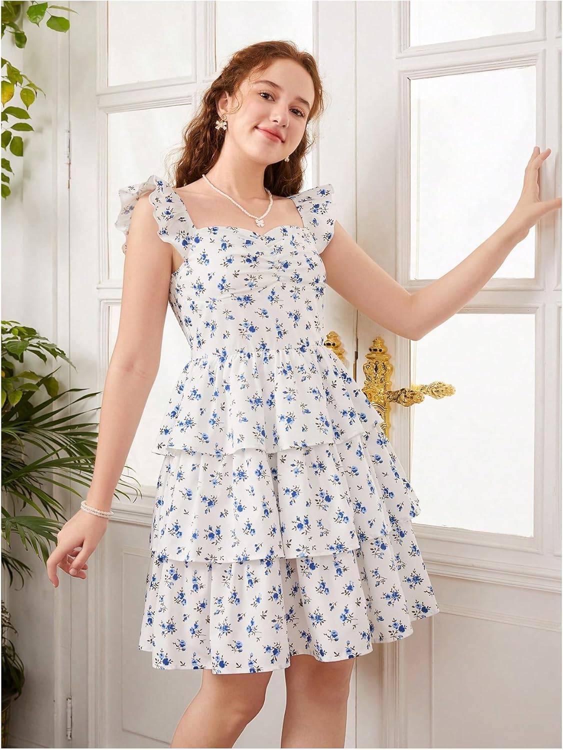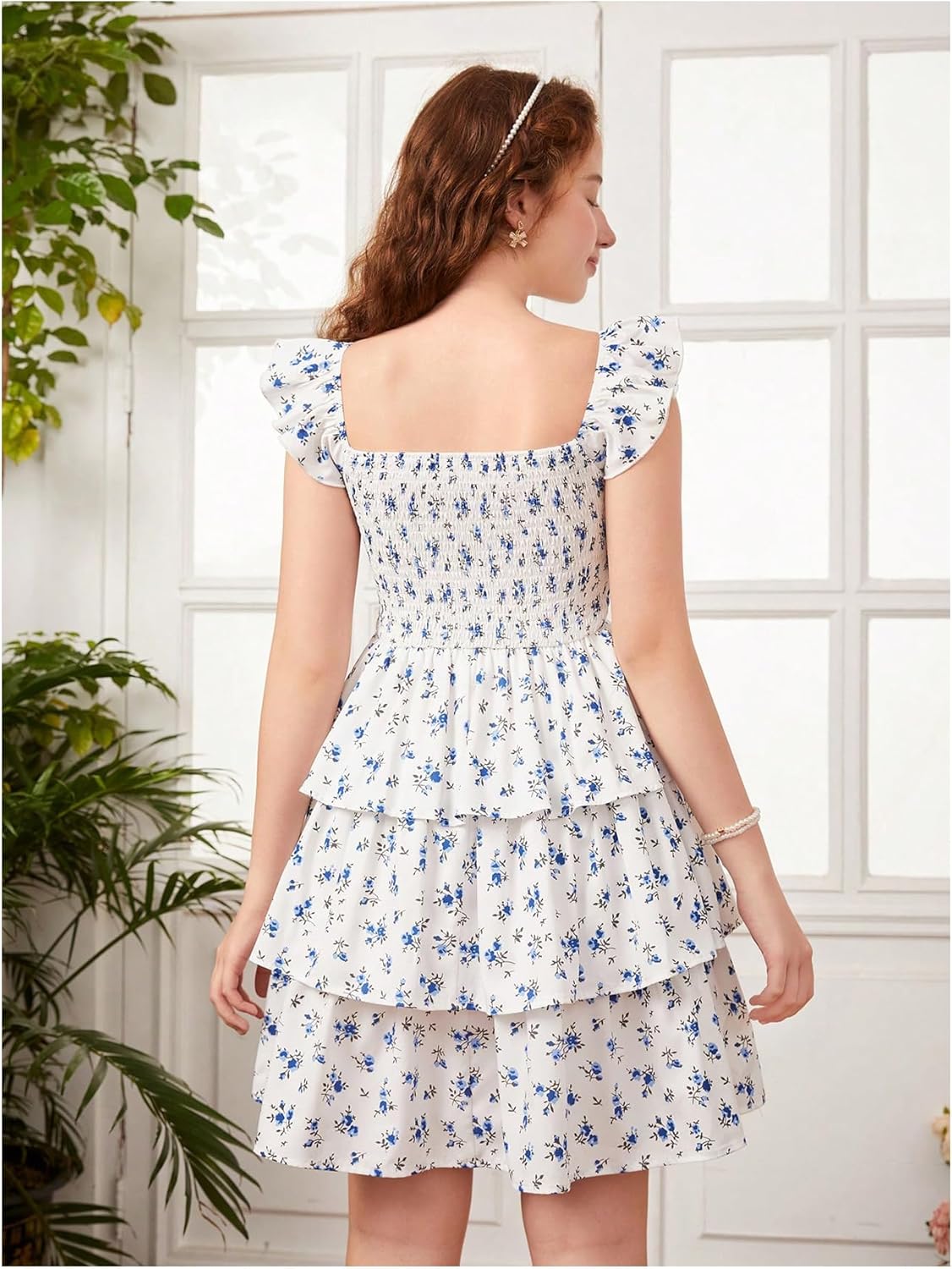 Girl’s Floral Summer Dress Ruffle Shirred High Waist Ruched Sweetheart A Line Spring Dress