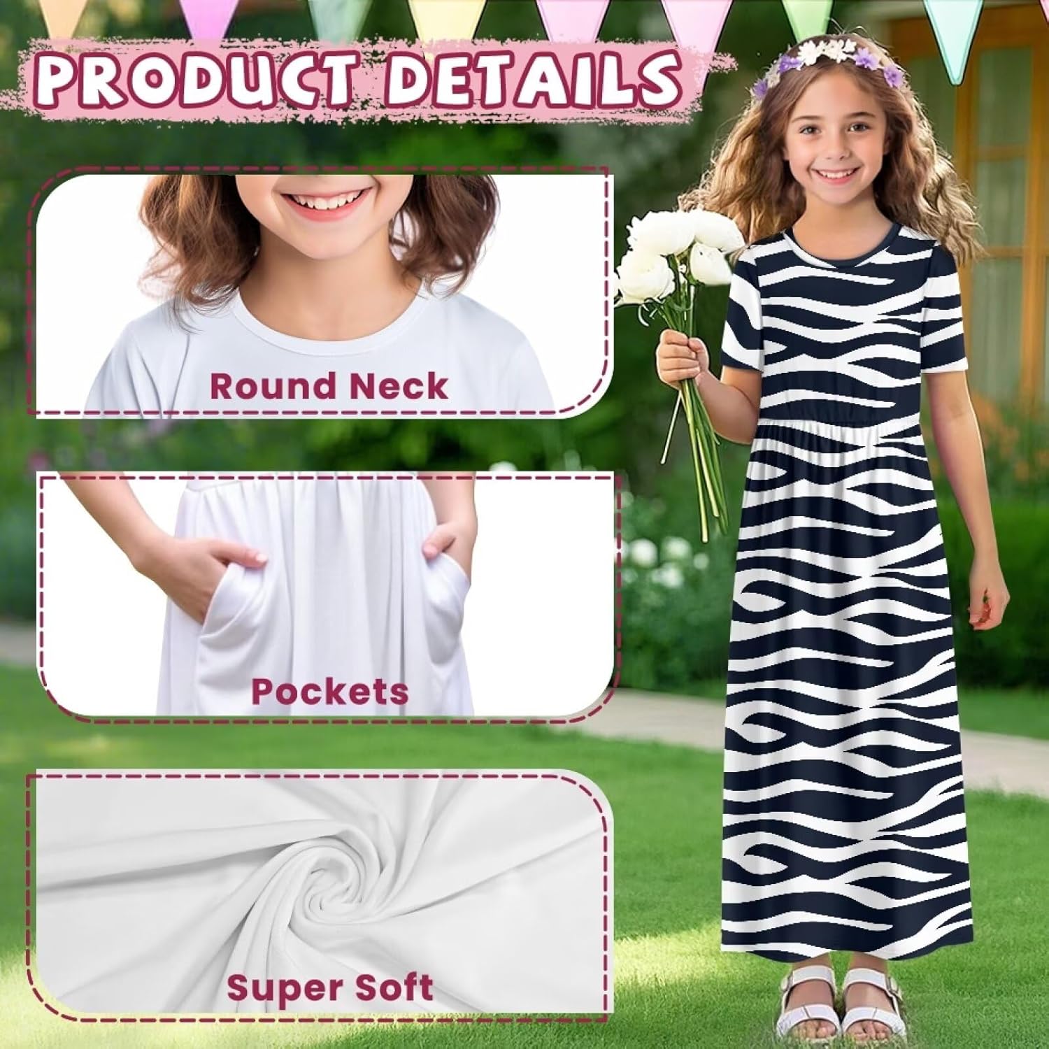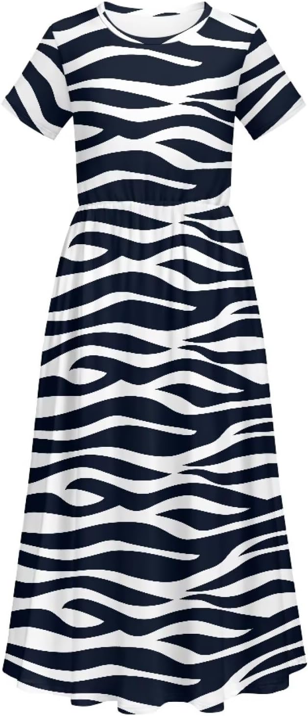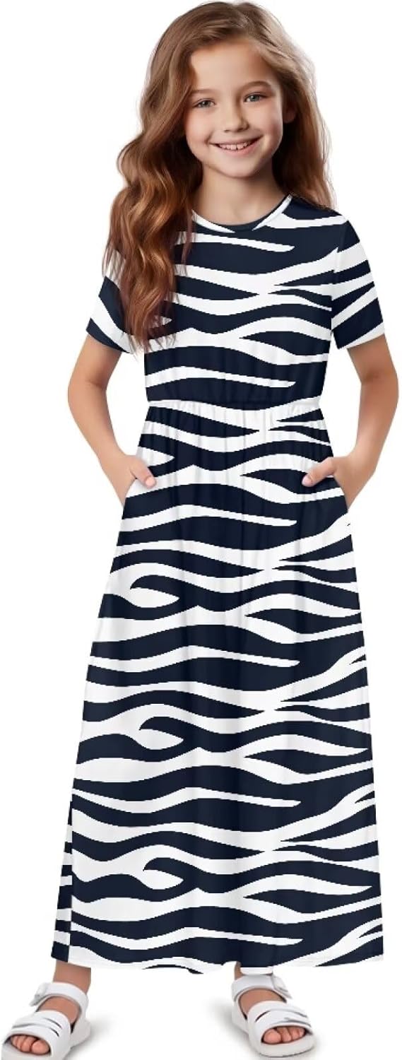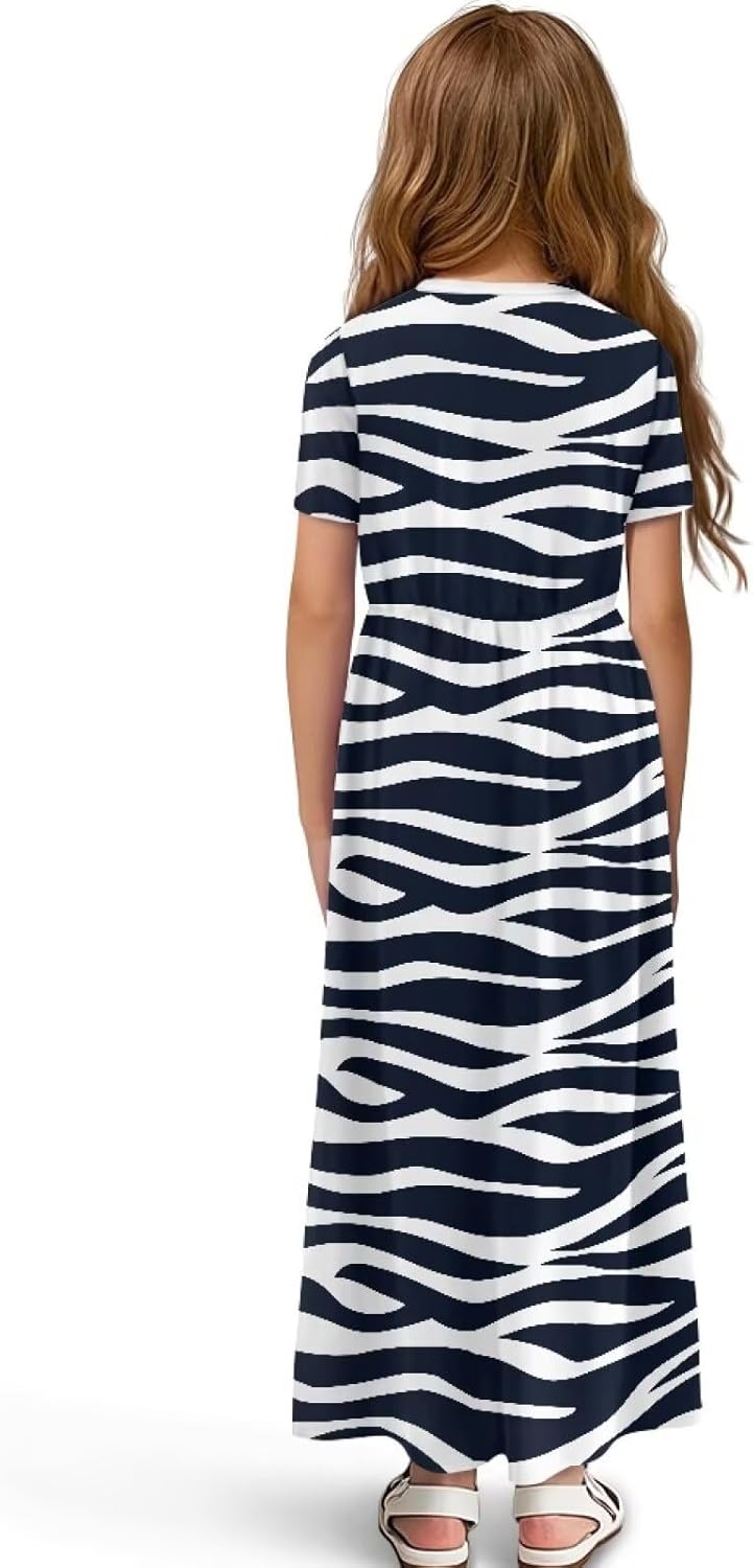 Girls Maxi Dresses Casual Loose Crewneck Sundress Short Sleeve with Pockets for Kids 5-14Y