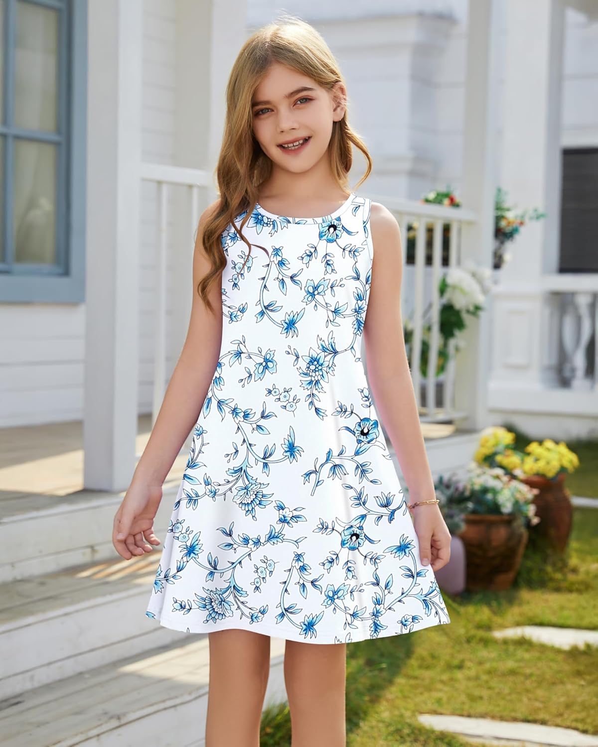 Girls Sleeveless Summer Dress Kids Crewneck Casual Mini Floral A Line Beach Sundresses with Pockets 5-14 Years