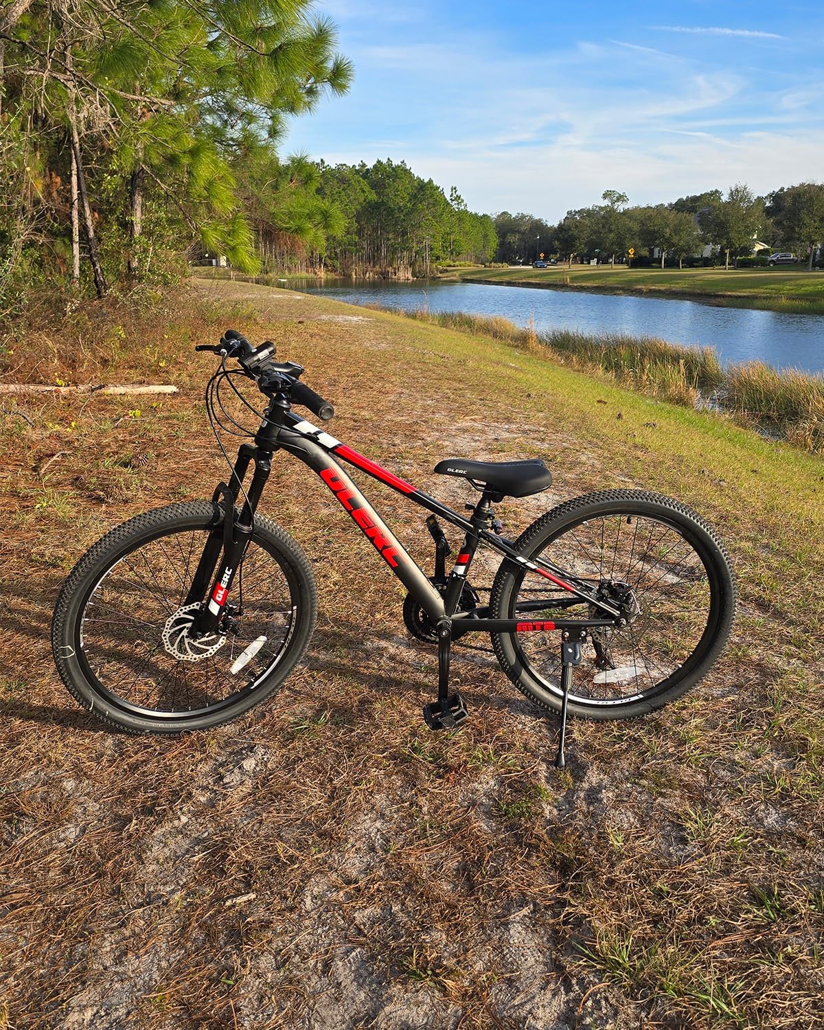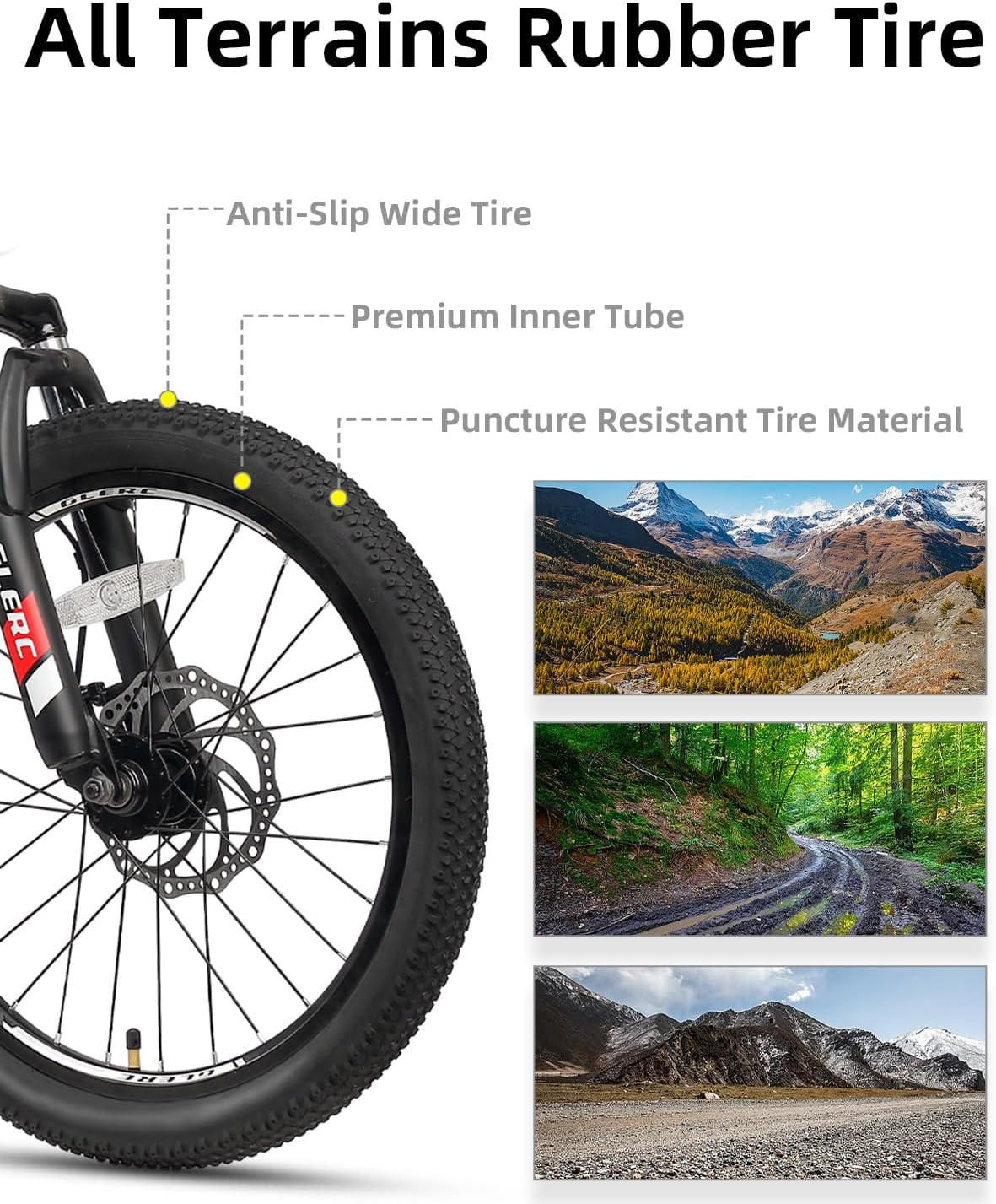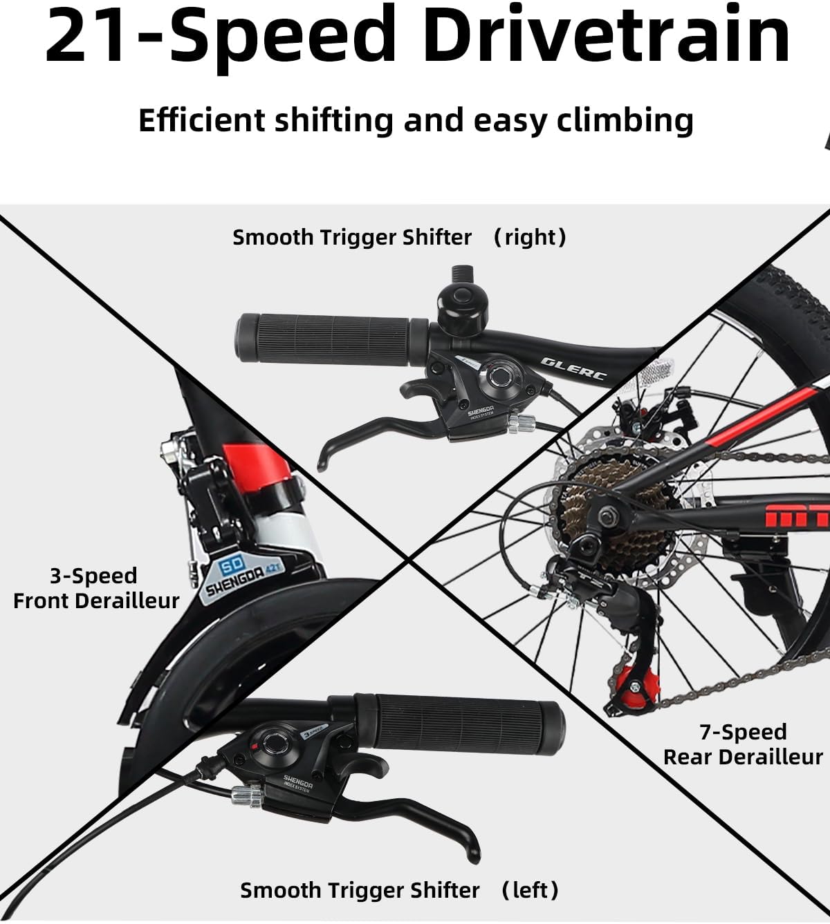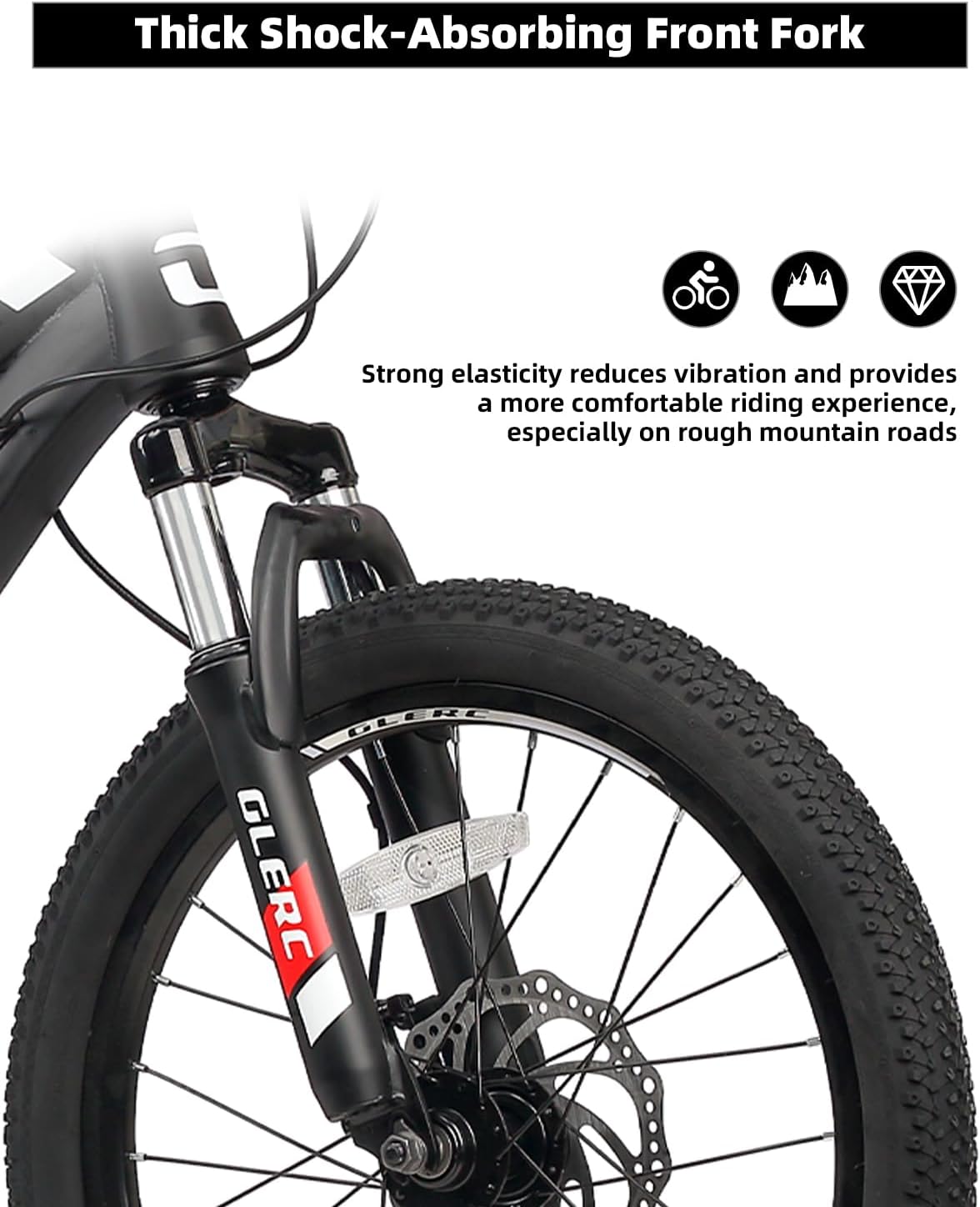 Variable SpeedsGlerc’s kids’ mountain bike boasts a 21-speed system, offering plenty of gear options. The 21-speed transmission reduces pedaling effort on inclines. Robust & SafeA high-carbon steel frame ensures durability, while aluminum disc brakes provide easy, secure stopping. The bike features sturdy, lightweight aluminum alloy rims and puncture-resistant tires. Aesthetic Brake CableThe brake cable is partially concealed for a clean look, minimizing wear. Non-slip pedals with a kickstand are included. Suspension DesignThe reinforced front suspension fork absorbs impacts and ensures control. Easy SetupThe bike arrives 85% assembled. The remaining assembly can be completed by the customer, with the package including the frame, pedals, bell, tool kit, reflectors, and a user manual.