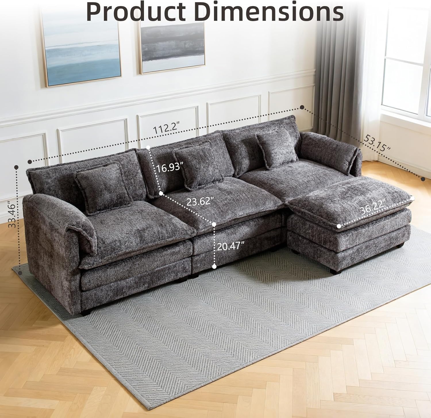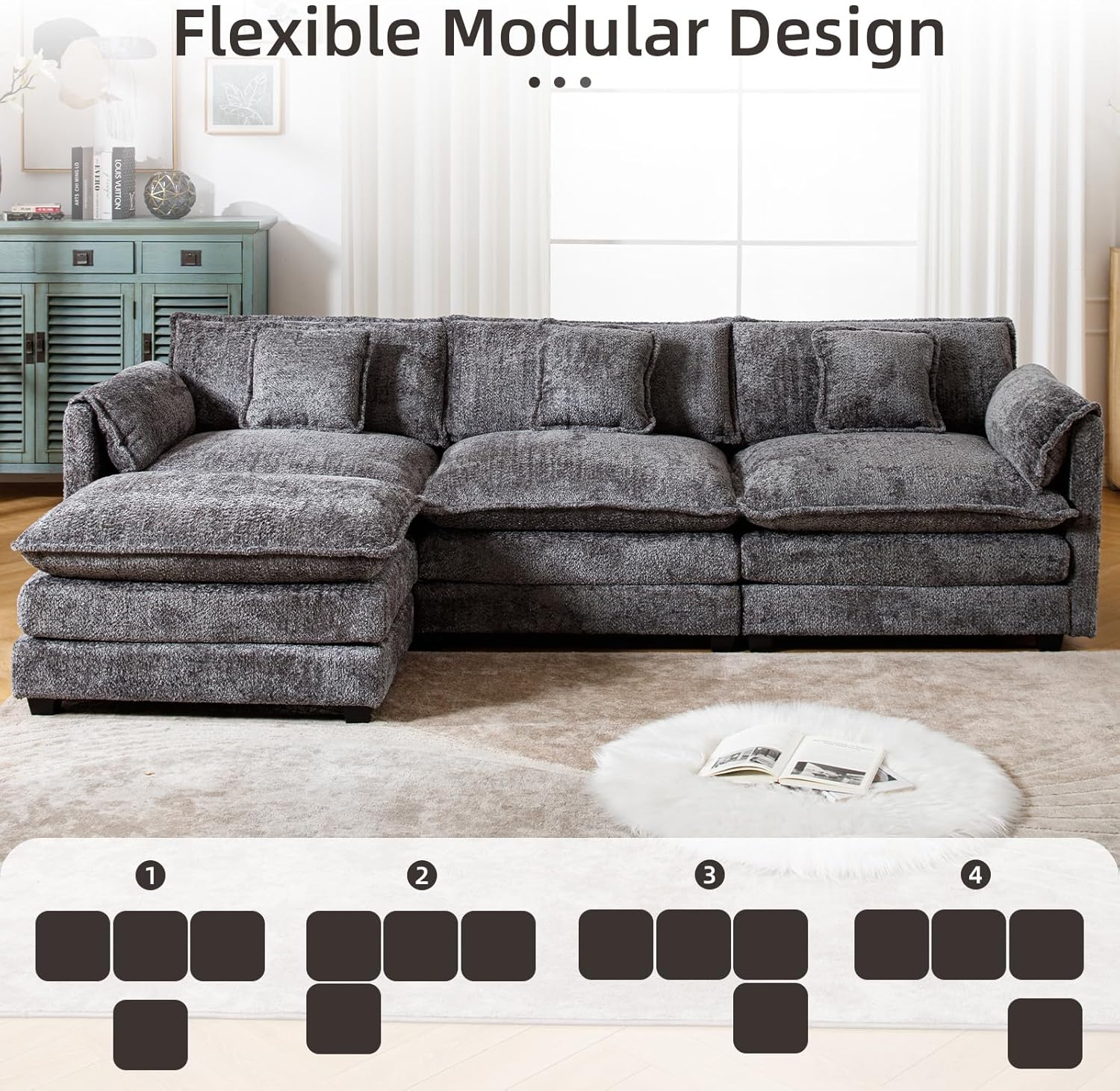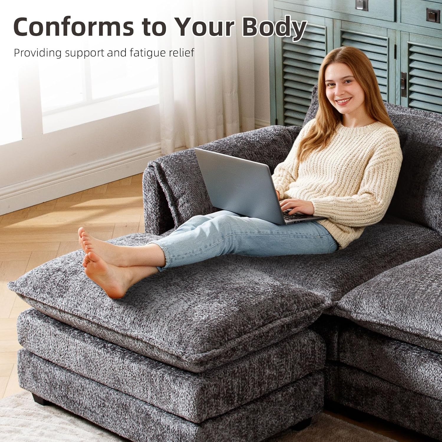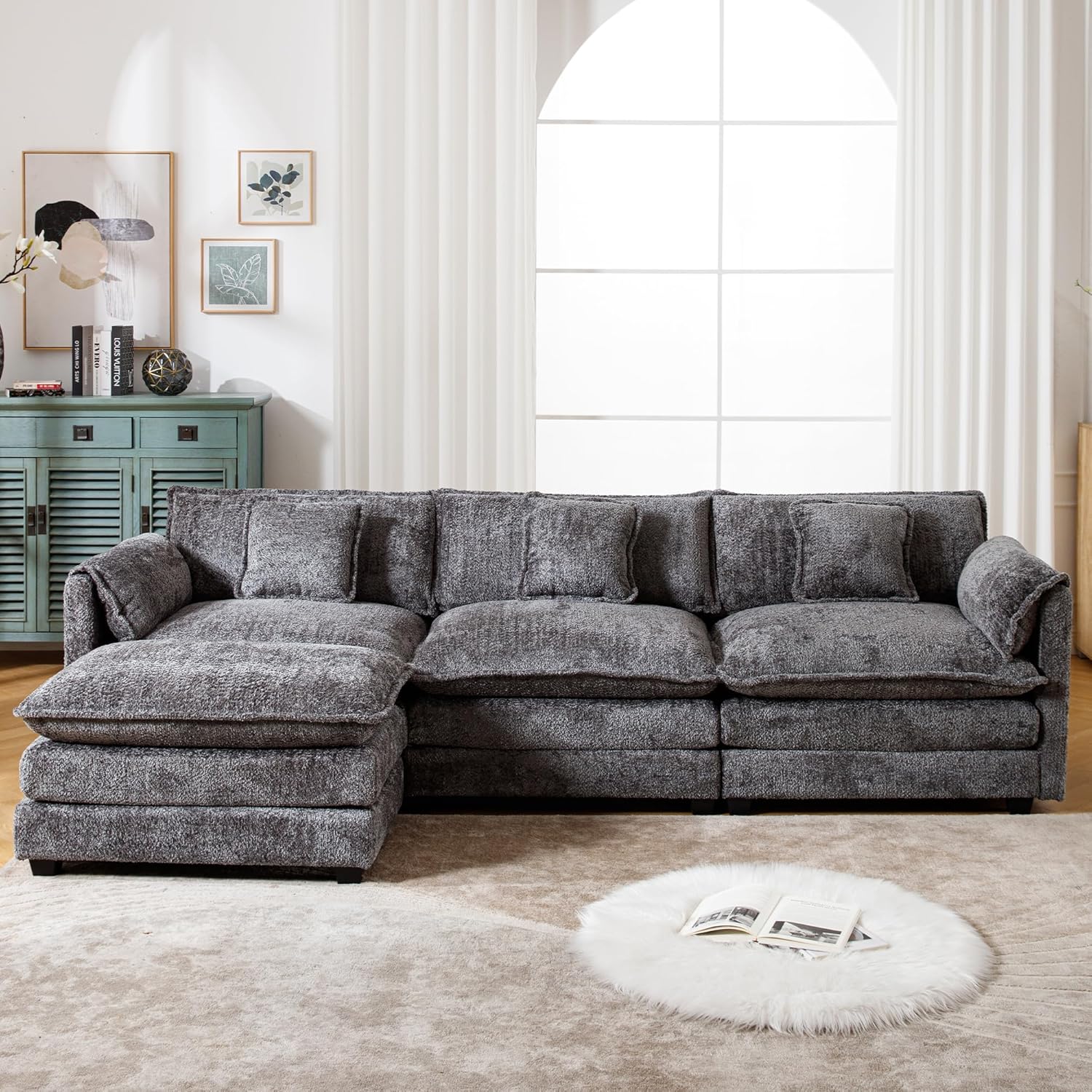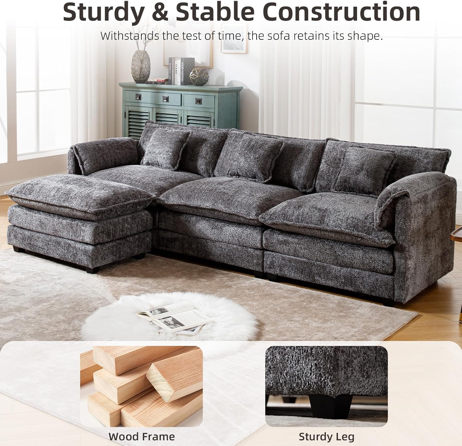 Solid Construction: Our fluffy sectional couches for living room is built on a sturdy hardwoo d frame, durable memory foam cushions are built into the fabric and the black solid wood legs perfectly support the entire sofa for long term use.