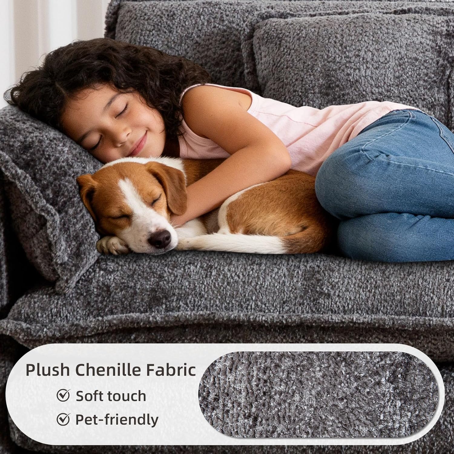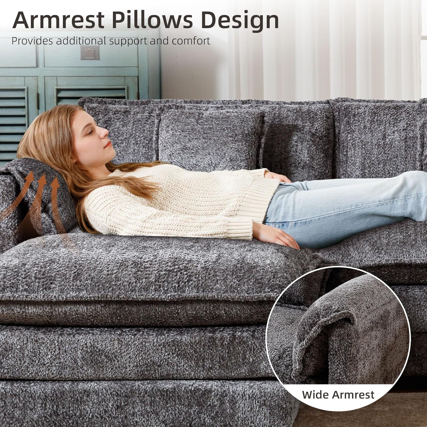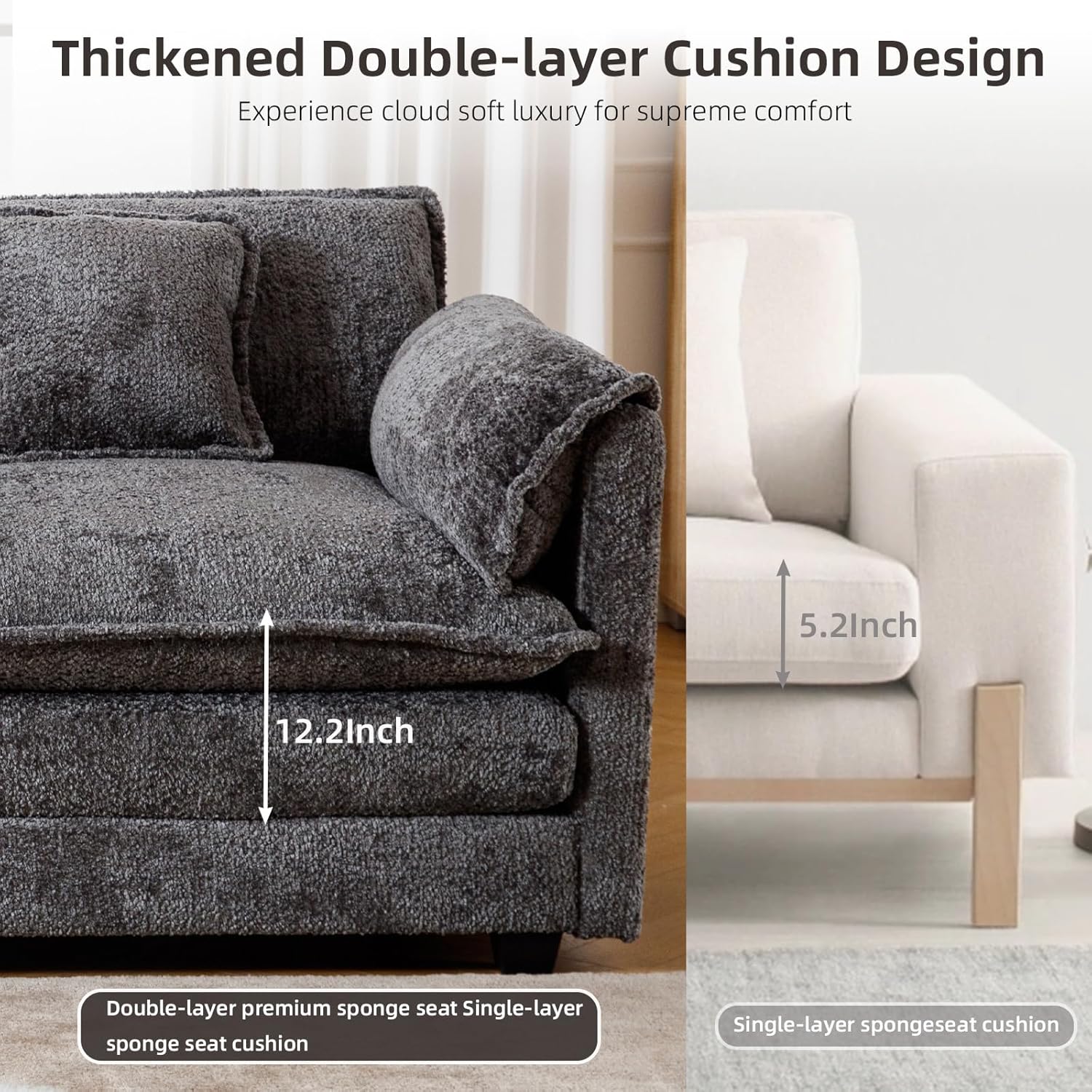 Comfy Chenille Fabric: The chenille fabric is soft and skin-friendly, providing a soft and comfortable touch and adding a sophisticated and luxurious look to the boucle couch.