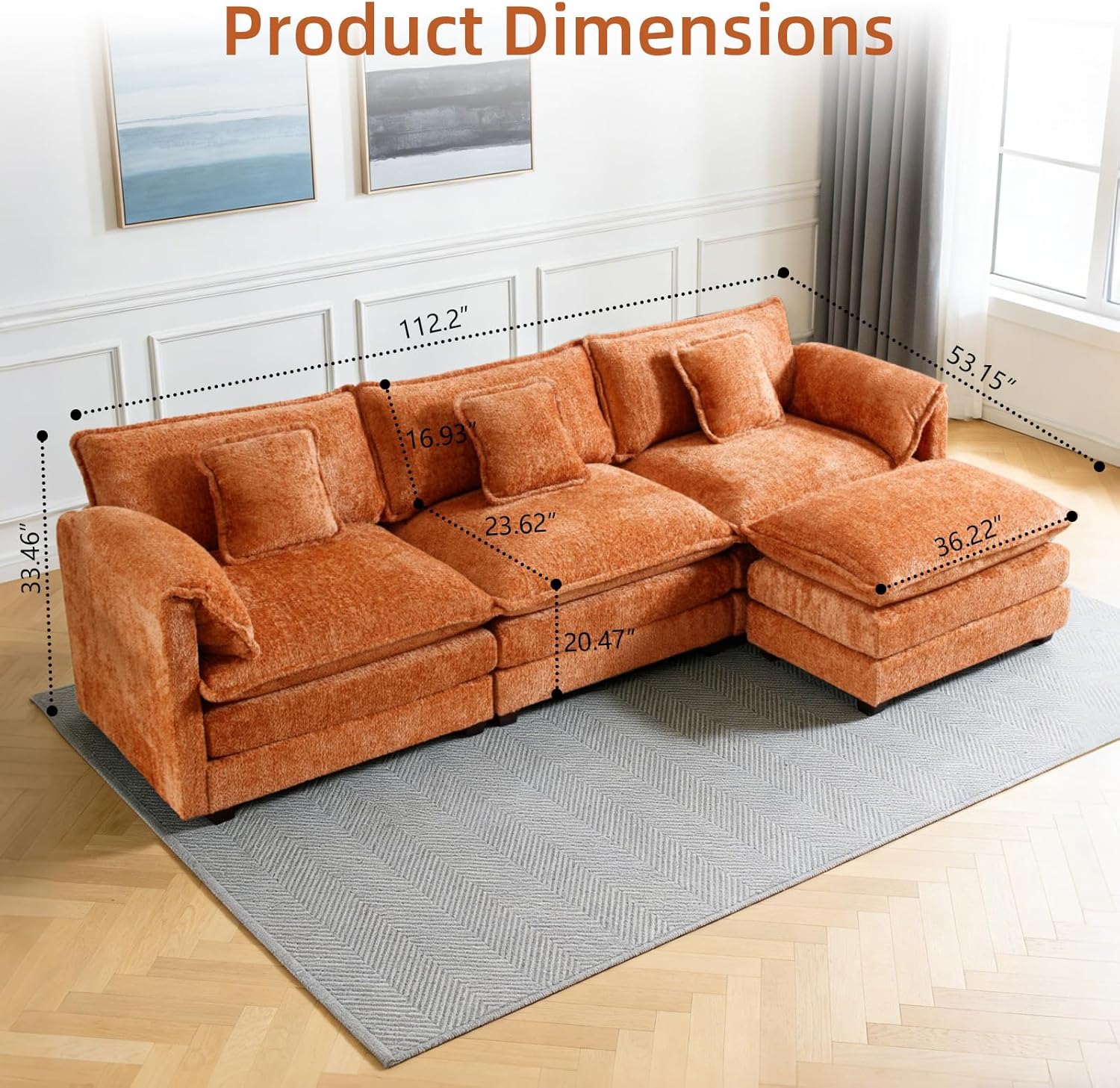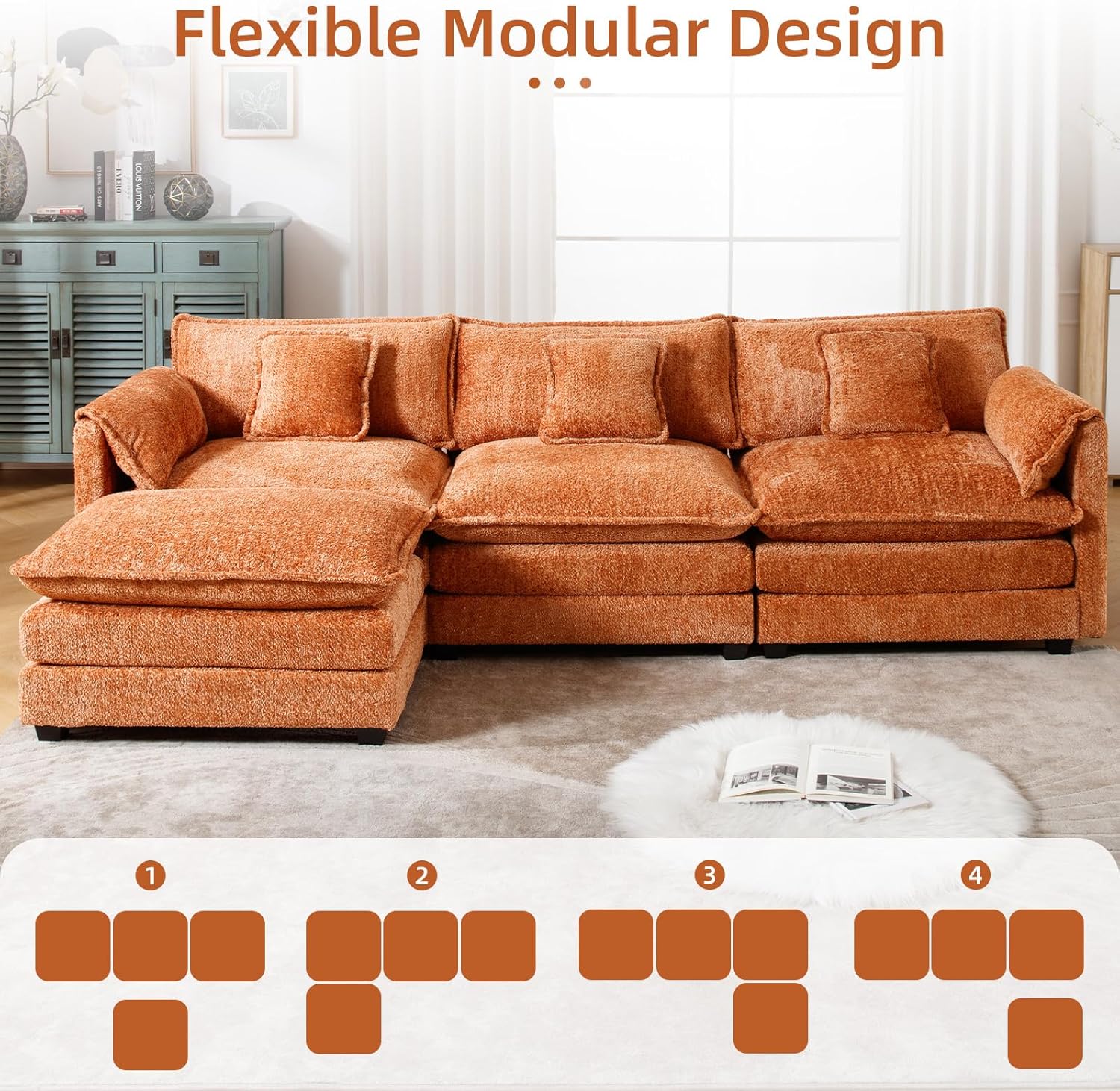 GNIXUU 112″ Orange Cloud sectional Couch, Modern Chenille L Shaped Couches for Living Room, Comfy 4 seat Modular Sofa with Moveable Ottoman & Memory Foam