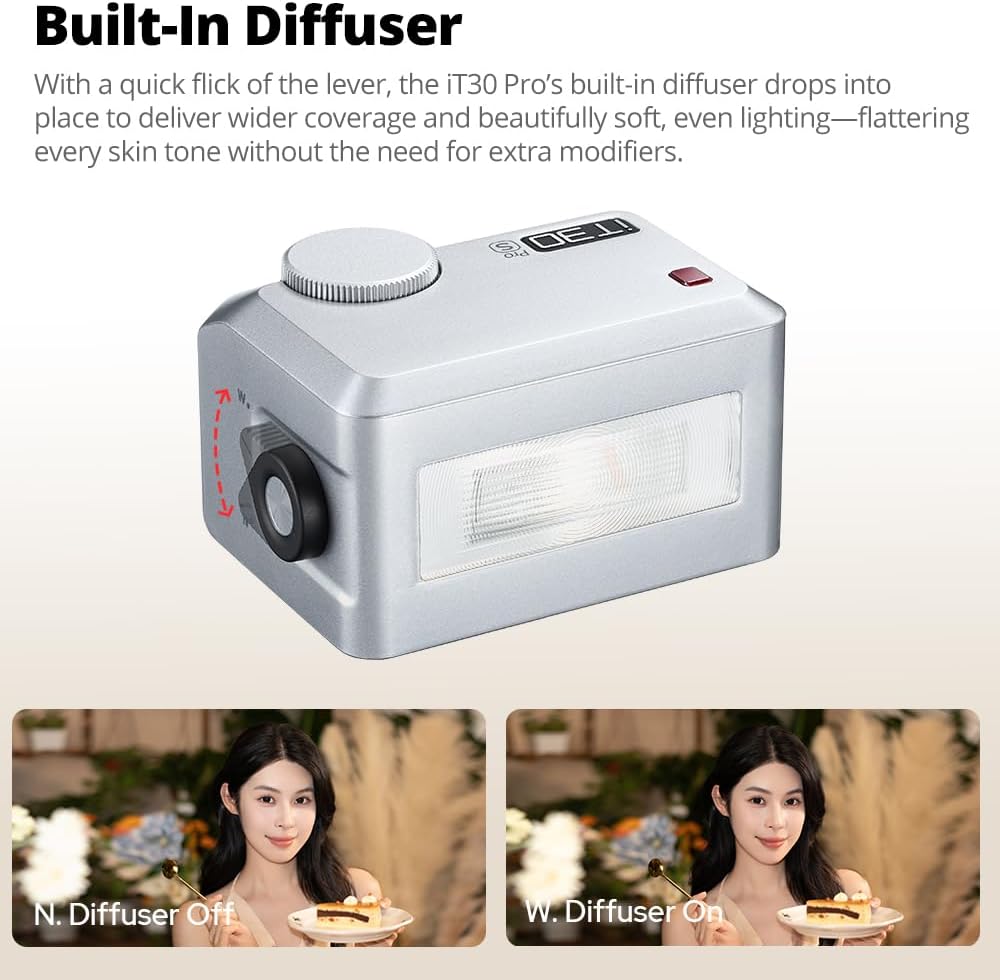 【Built-in Diffuser】: With a quick flick of the lever, the iT30 Pro’s built-in diffuser drops into place to deliver wider coverage and beautifullysoft,even lighting-flattering every skin tone without the need for extra modifiers.