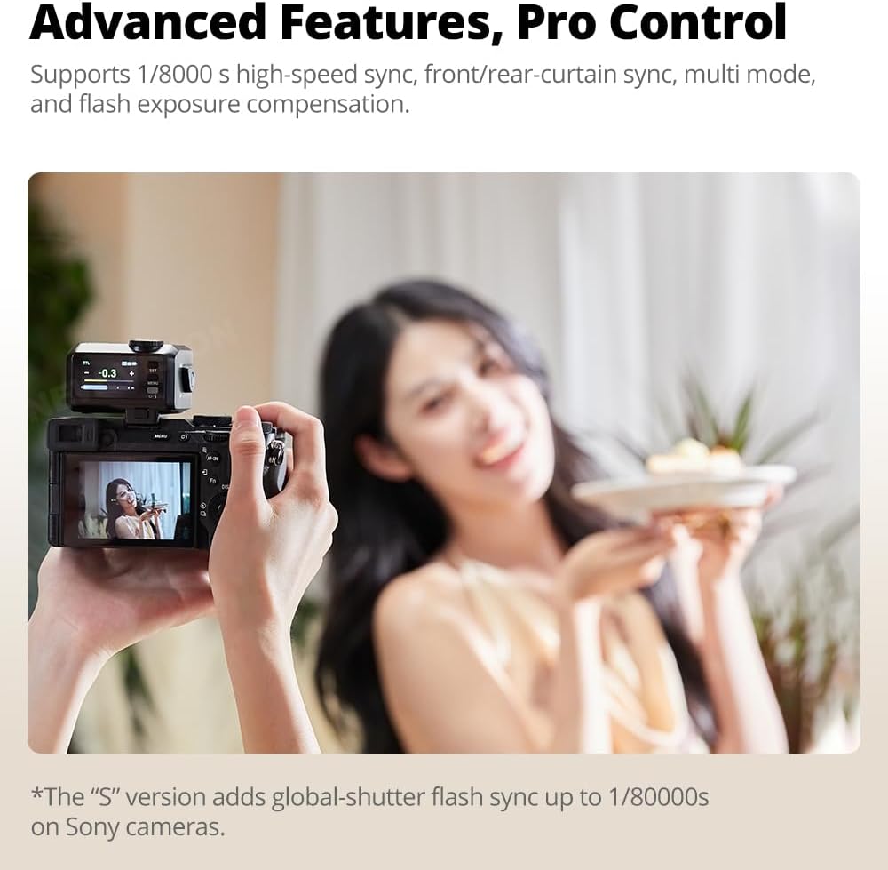 【Advanced Features,Pro Control】: Supports 1/8000s high-speed sync, front/rear curtain sync, multi mode, and flash exposure compensation.(The”S” version adds global-shutter flash sync up to 1/80000s on Sony cameras.)