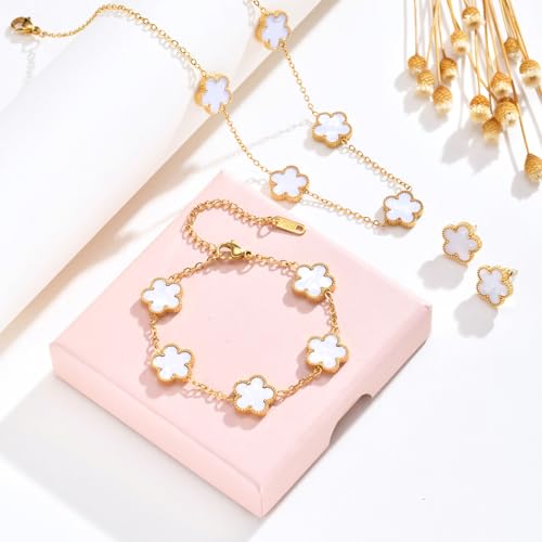 Gold Necklaces Bracelets Earring Set – 18K Gold Plated Flower Bracelet Chain,Stainless Steel Non Tarnish Floral Pendant Stud Jewelry Sets,Christmas Birthday Lucky Gift for Mom Wife Daughter Girlfriend