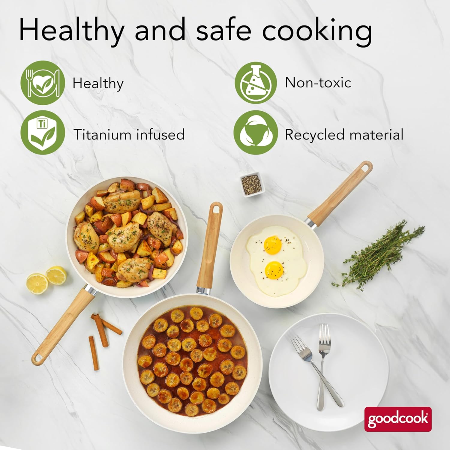 HEALTHY AND SAFE COOKING: Toxin free, nonstick titanium-infused ceramic surface uses less oil but still provides easier cleanup and lasting durability.