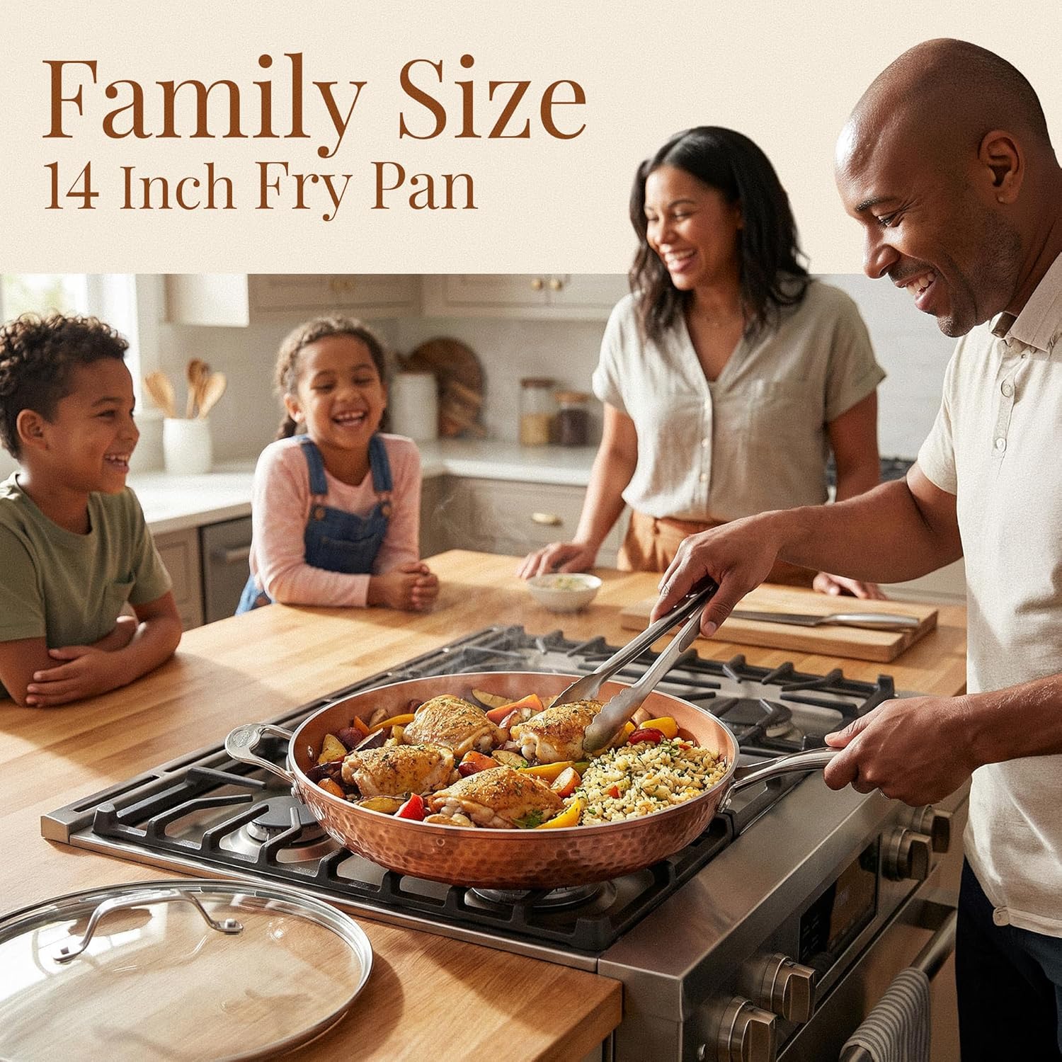 Gotham Steel 14” Frying Pan Hammered Copper Nonstick Cookware Pan with Ceramic Surface, Includes Glass Lid, Extra Large Skillet with Stainless Steel Stay Cool & Helper Handle, Oven & Dishwasher Safe