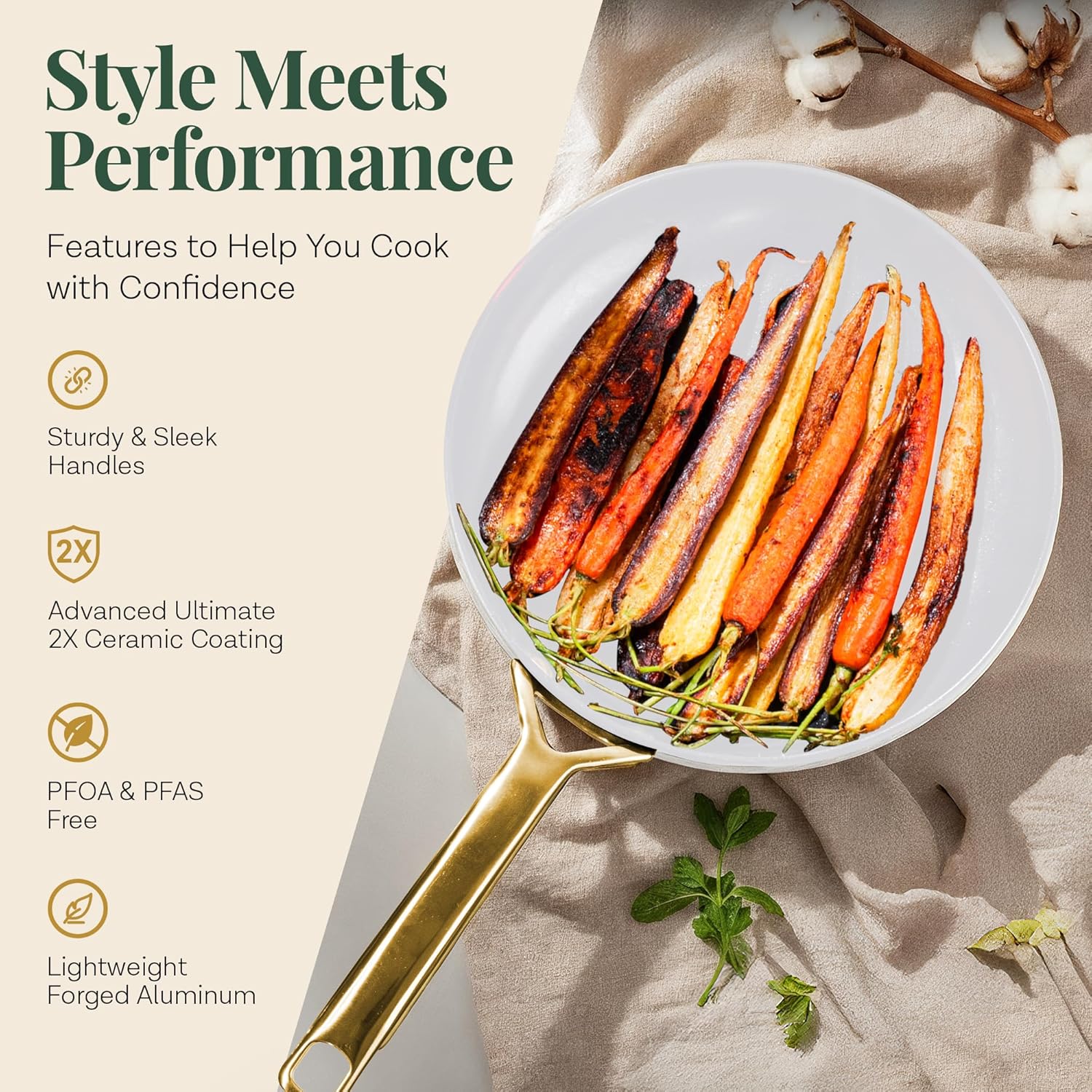 DOUBLE COATED CERAMIC NONSTICK: Reinforced with titanium, our ceramic nonstick surface is now twice as durable as before. Food won’t stick, even with little to no oil, making cleanup effortless and cooking healthier.