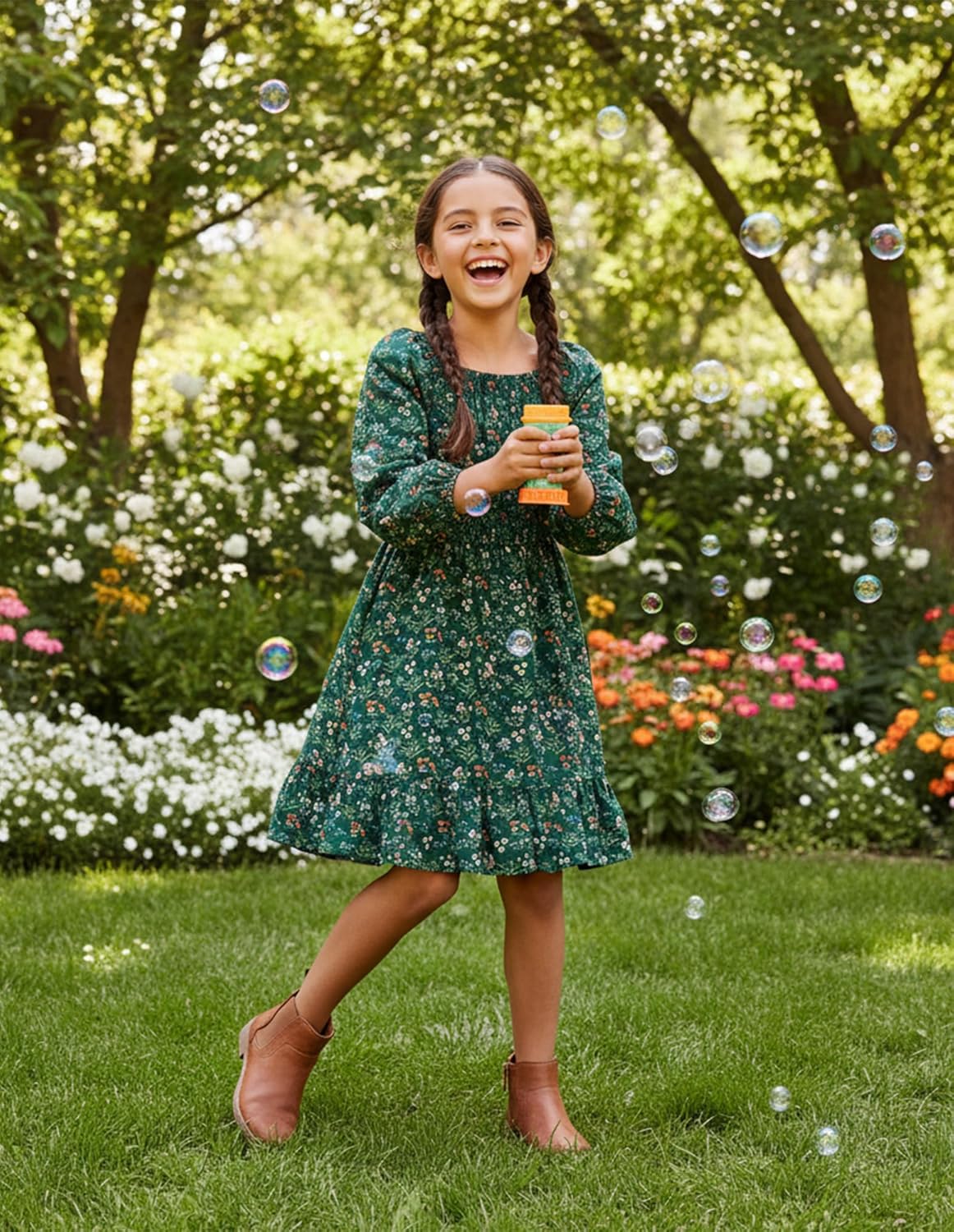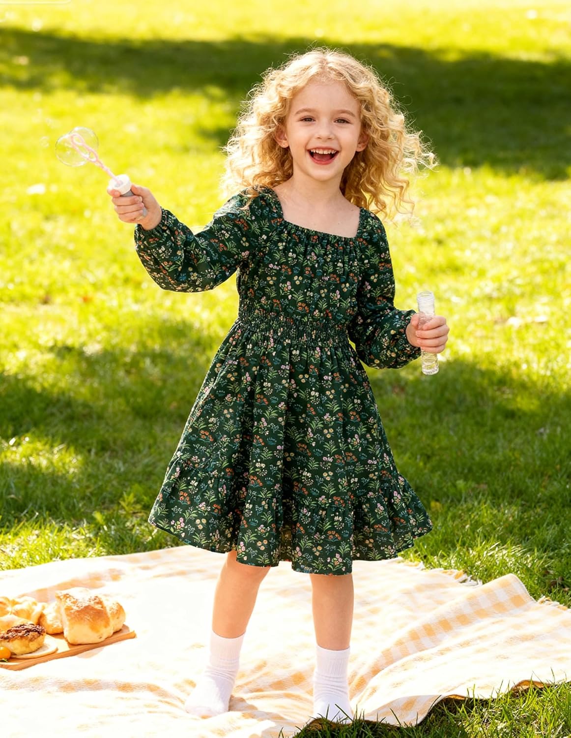 Little Woodland Sprite! See her twirl like a forest fairy in this enchanting Green Floral Dress. The soft sleeves and flowing skirt are made for skipping through crunchy leaves and chasing autumn breezes. Pure magic captured in a real customer moment!