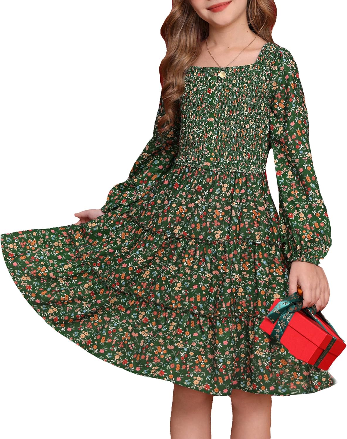 GRACE KARIN Girls Fall Long Sleeve Floral Square Neck Smock Tiered Casual Holiday Teen Dress Size 5-14