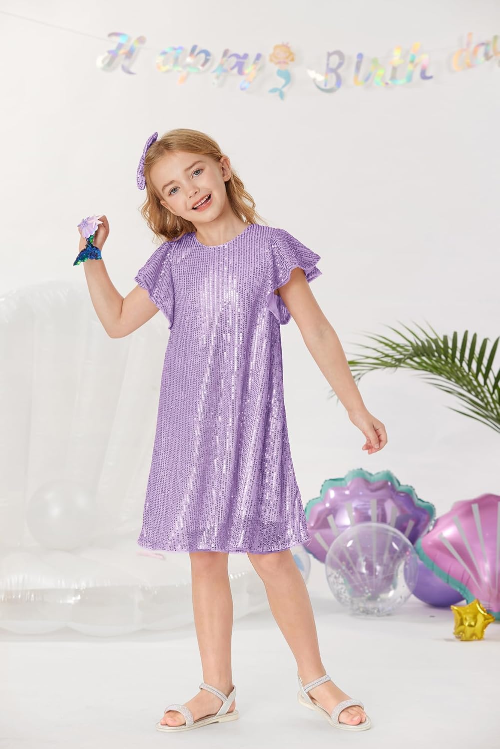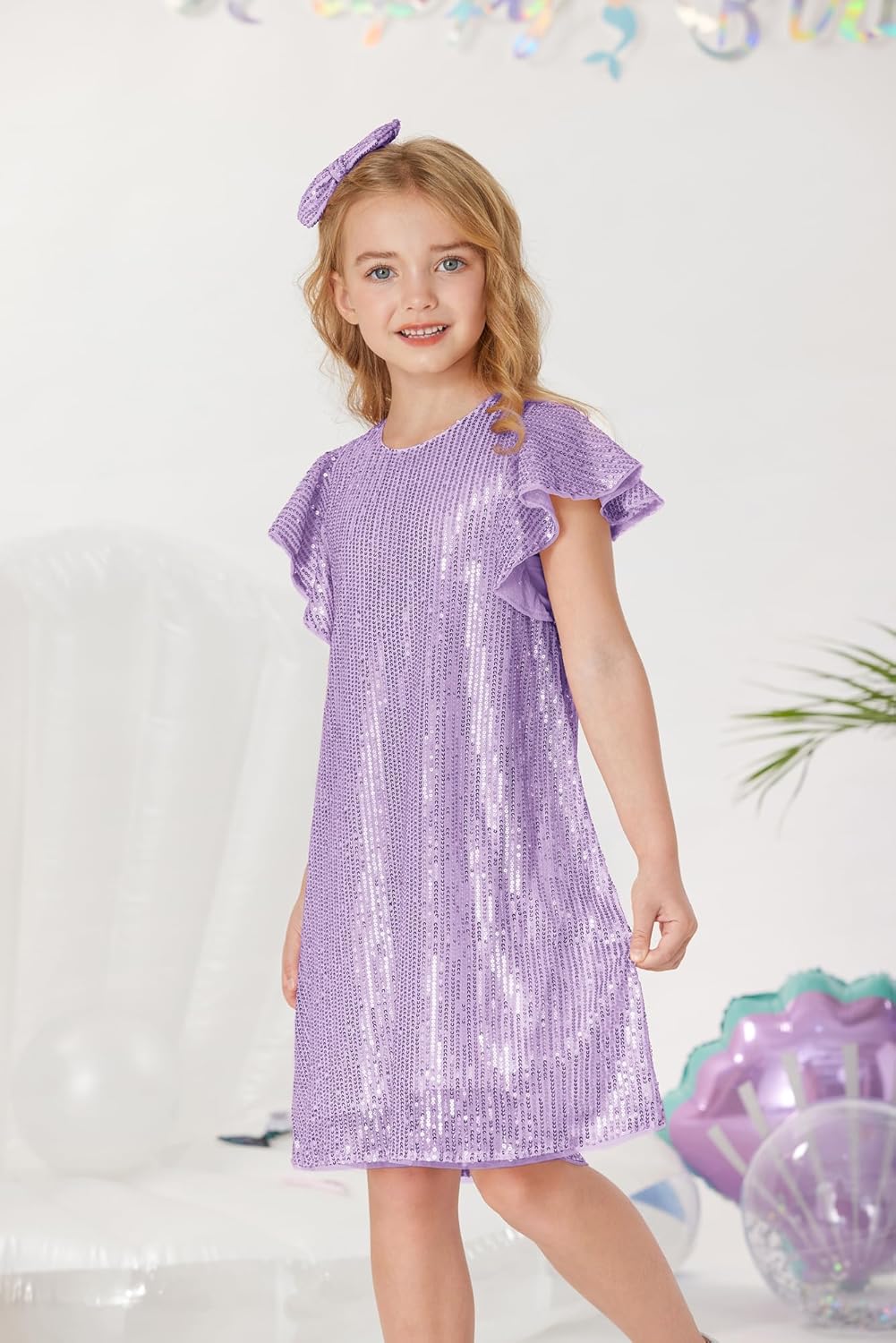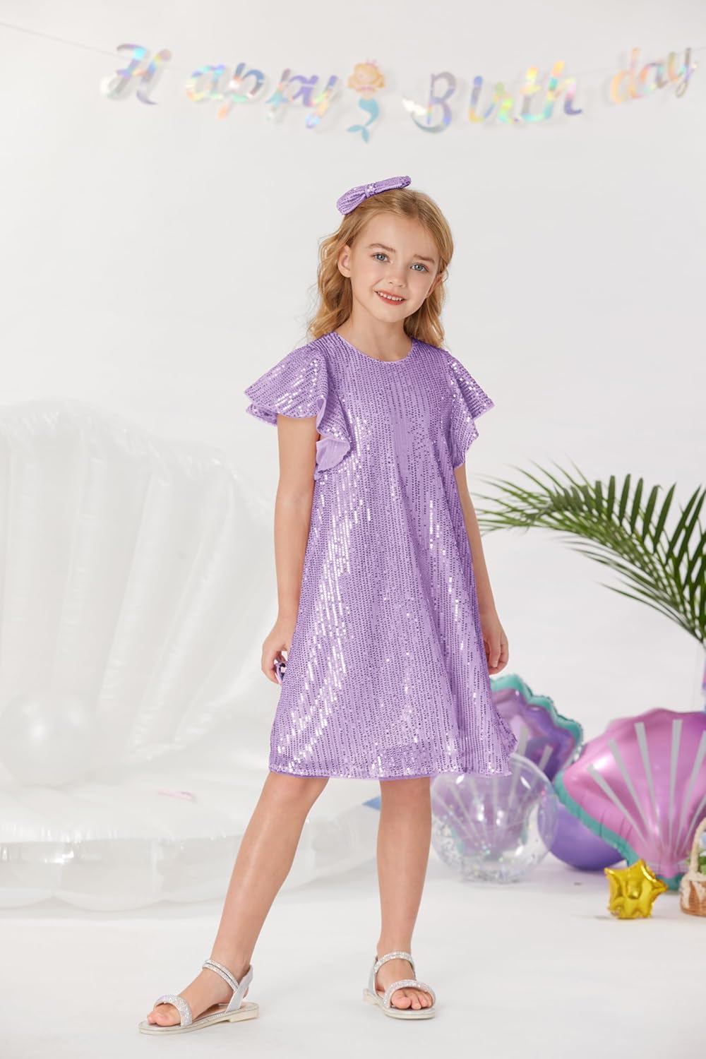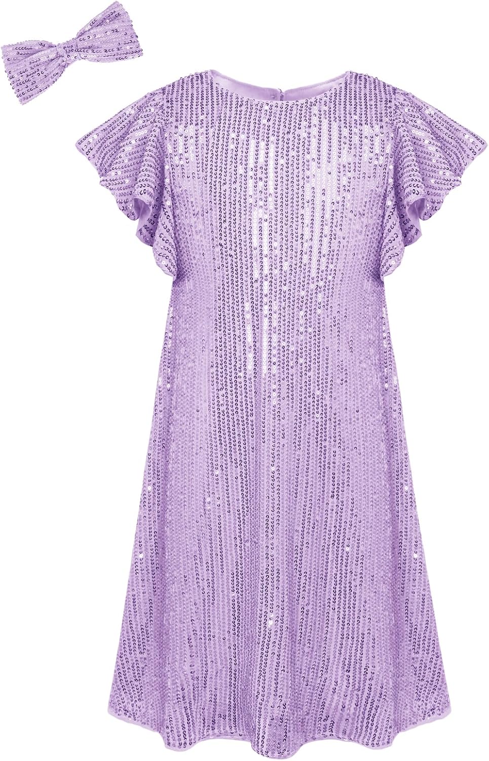 GRACE KARIN Girls Sequin Dress Short Flutter Sleeve Flare Silhouette Midi Dress with Hairbow 5-12Y