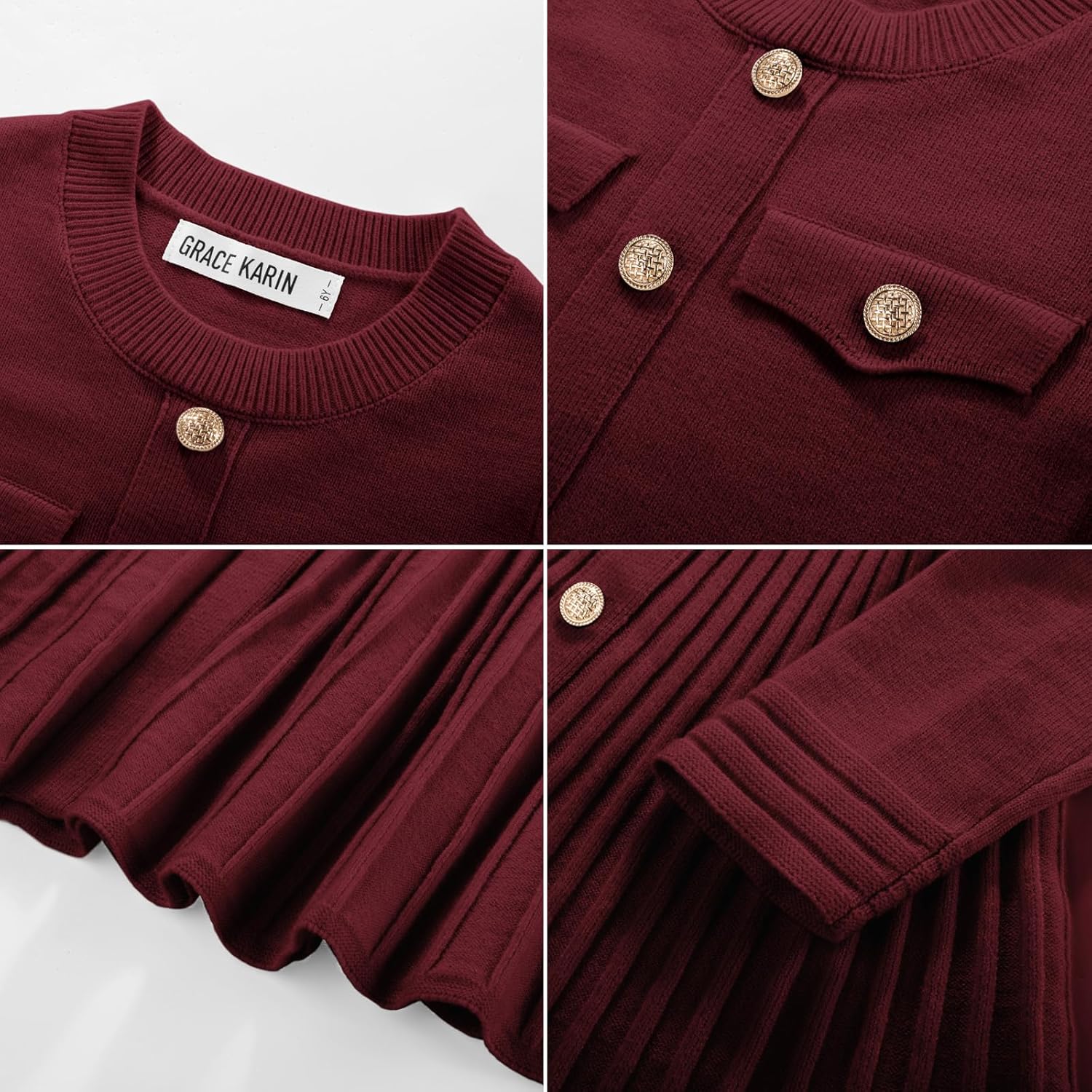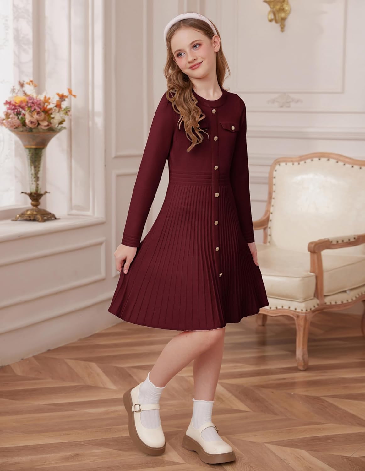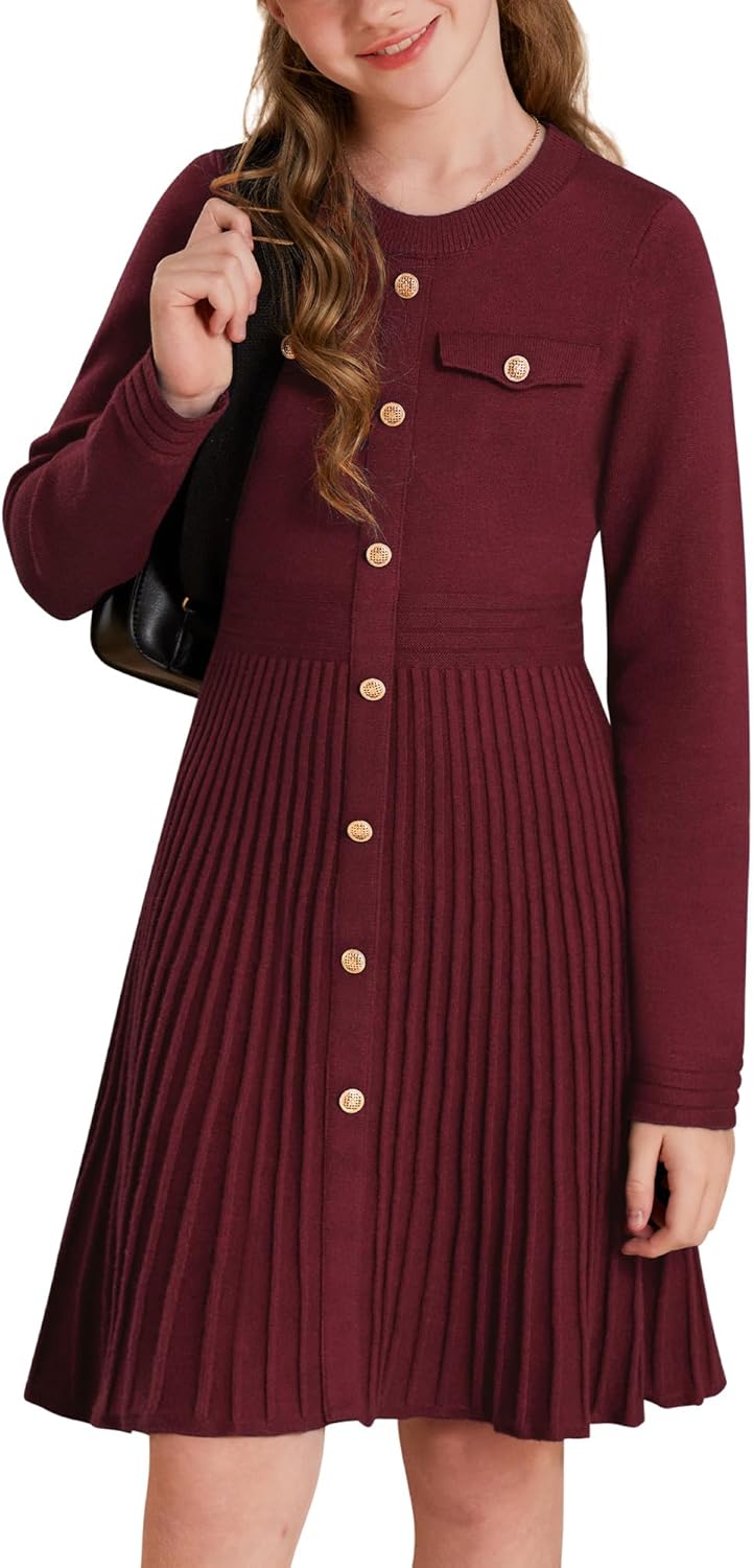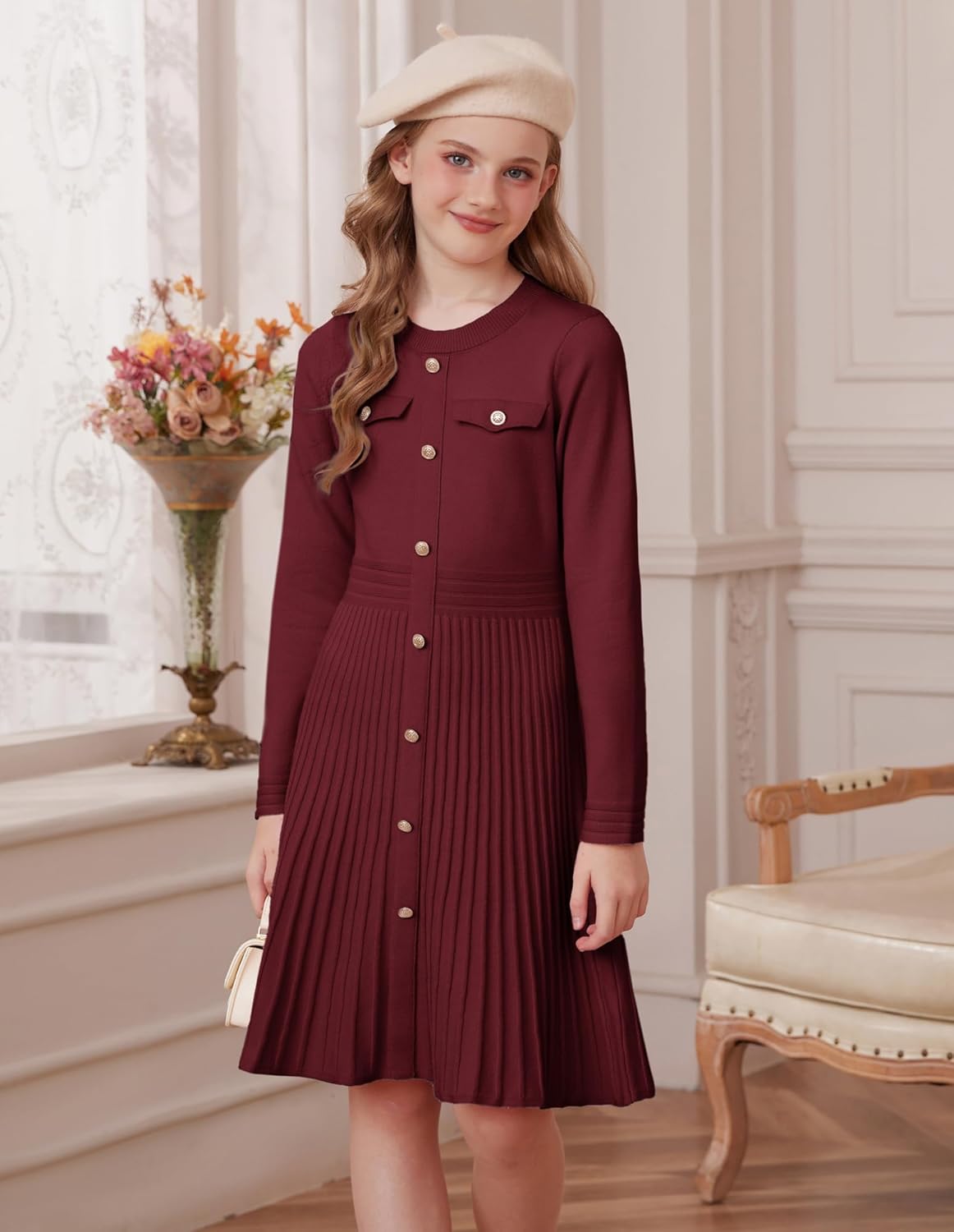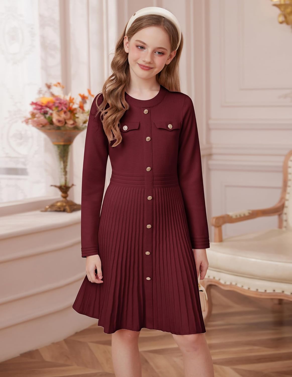 GRACE KARIN Girls Sweater Fall Dress Long Sleeve Knit Button Front Pleated A-Line Casual Winter Midi Dresses 5-14Y