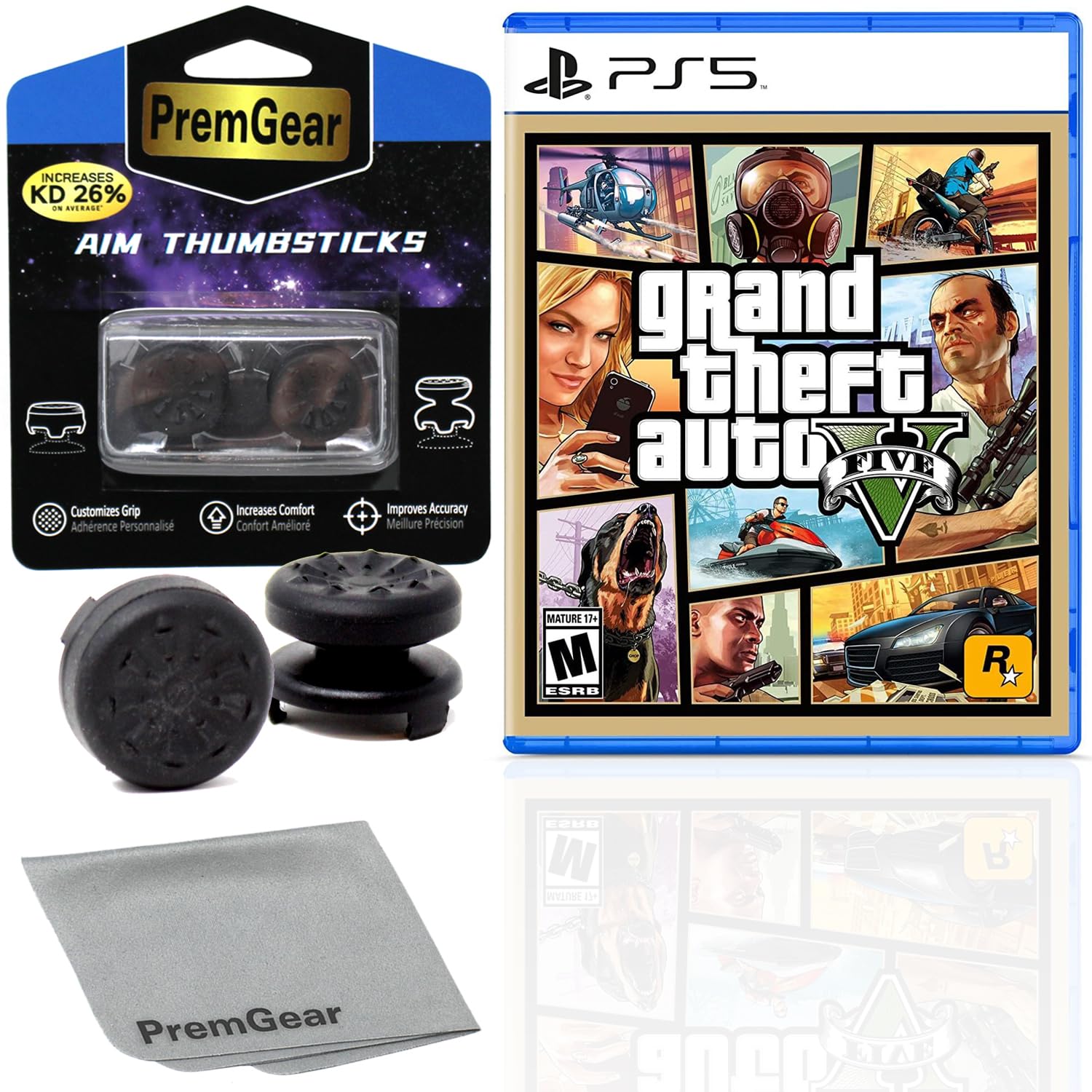 Included is the following: Grand Theft Auto V for PlayStatio 5 PS5, 2 pack of PremGear 2 Sizes Thumbsticks made to increase accuracy and comfort (1 High-Rise, 1 Mid-Rise), PremGear Quality Cleaning Cloth