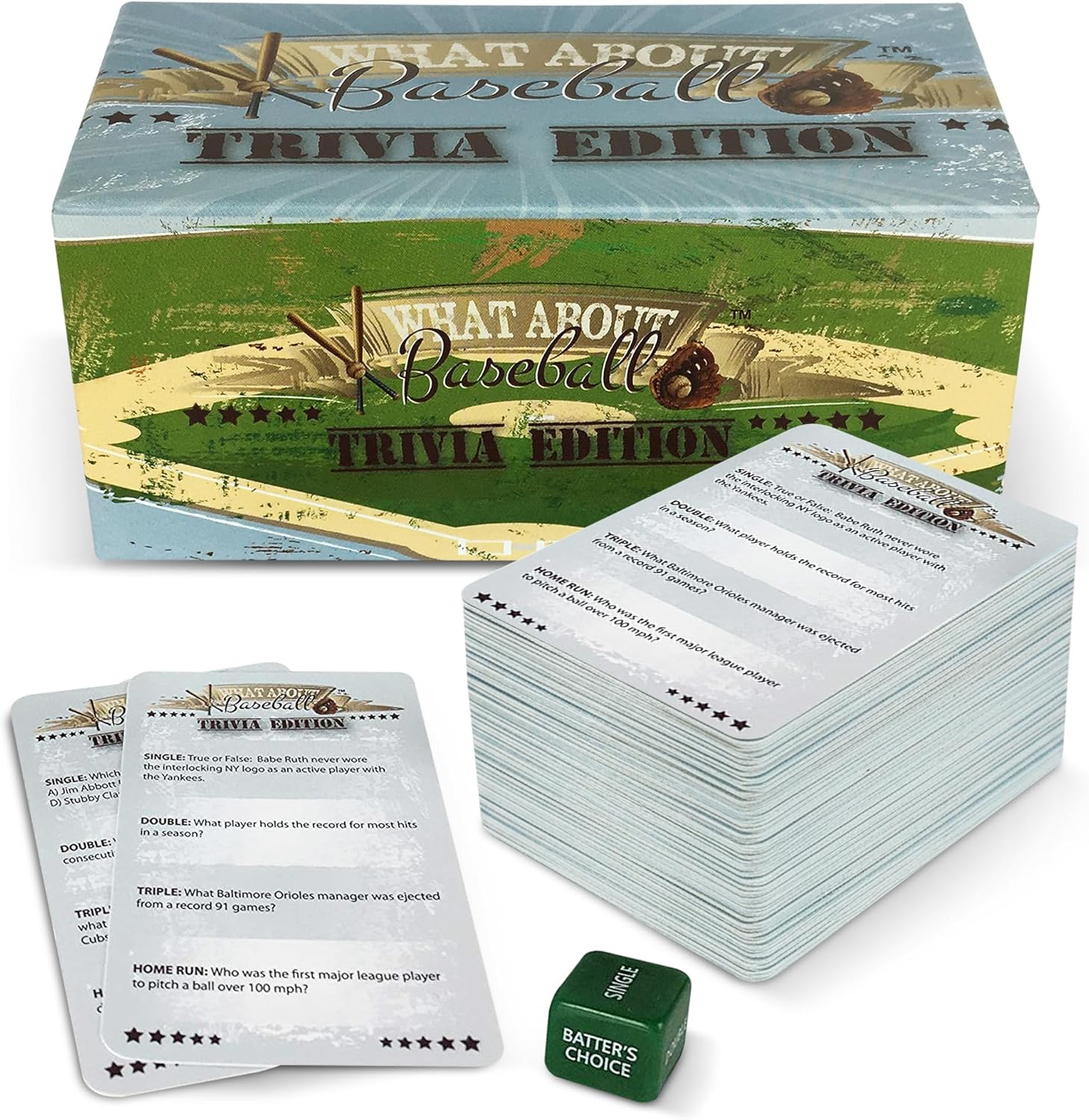 This What About Baseball Trivia Edition is perfect for the baseball fan that loves stats and facts about America’s past time! Think you know it all? Take a swing and give it a shot! No batteries required! Nothing electronic here! Take this compact set of baseball wisdom on vacation or to the ball field. Includes one die to dictate the action, as well as 500 awesome baseball questions. Bring back family game night! Maybe the whole family enjoys rooting for the home team. Get some quality family time and get to see who in the family really knows their hardball history. Proudly MADE IN THE USA, just like the original board game that inspired this trivia game. Anyone can play! Don’t know a lot about baseball? Just use the questions marked as SINGLES or DOUBLES. Think you know it all? Play a full game and see if our TRIPLES and HOME RUNS strike you out or not.