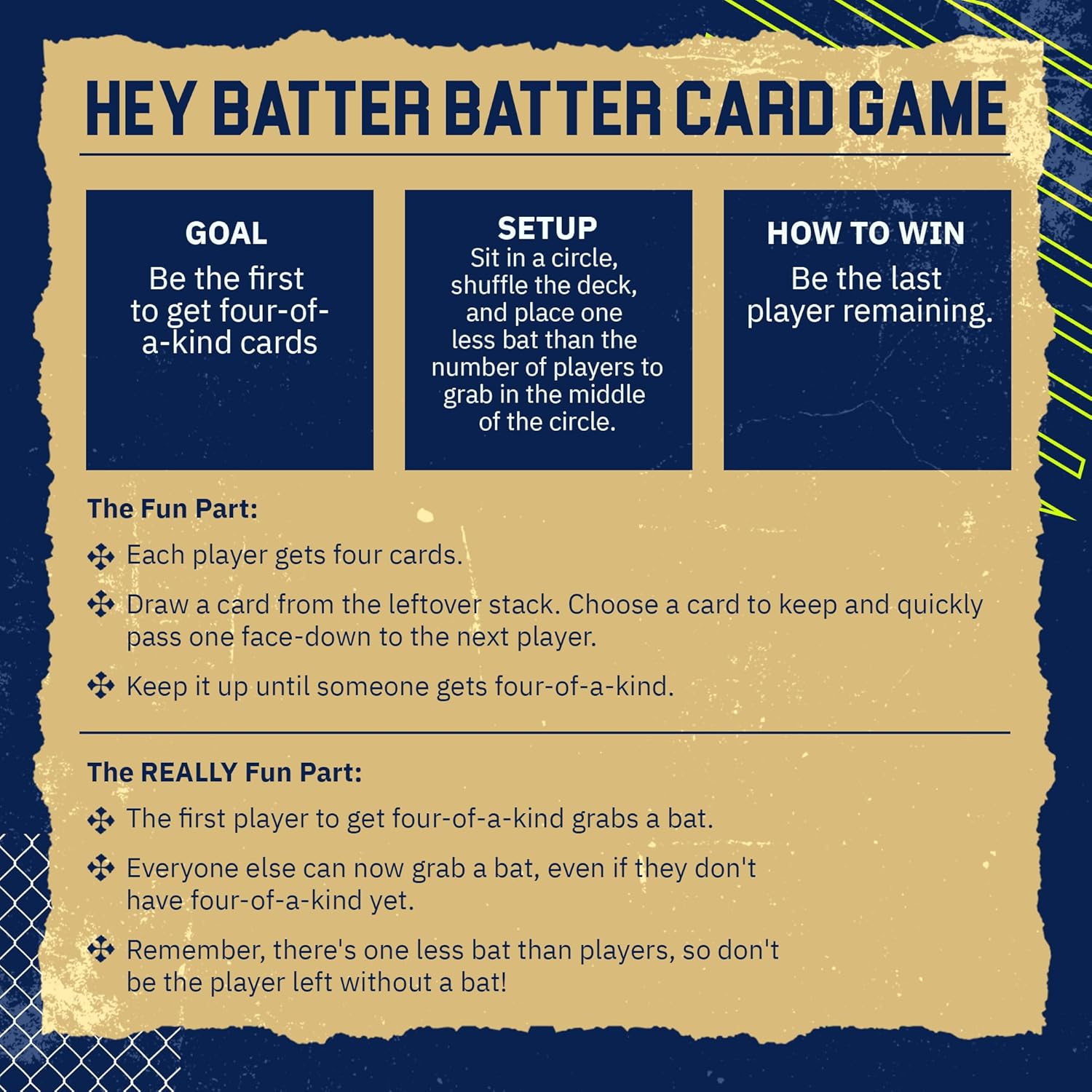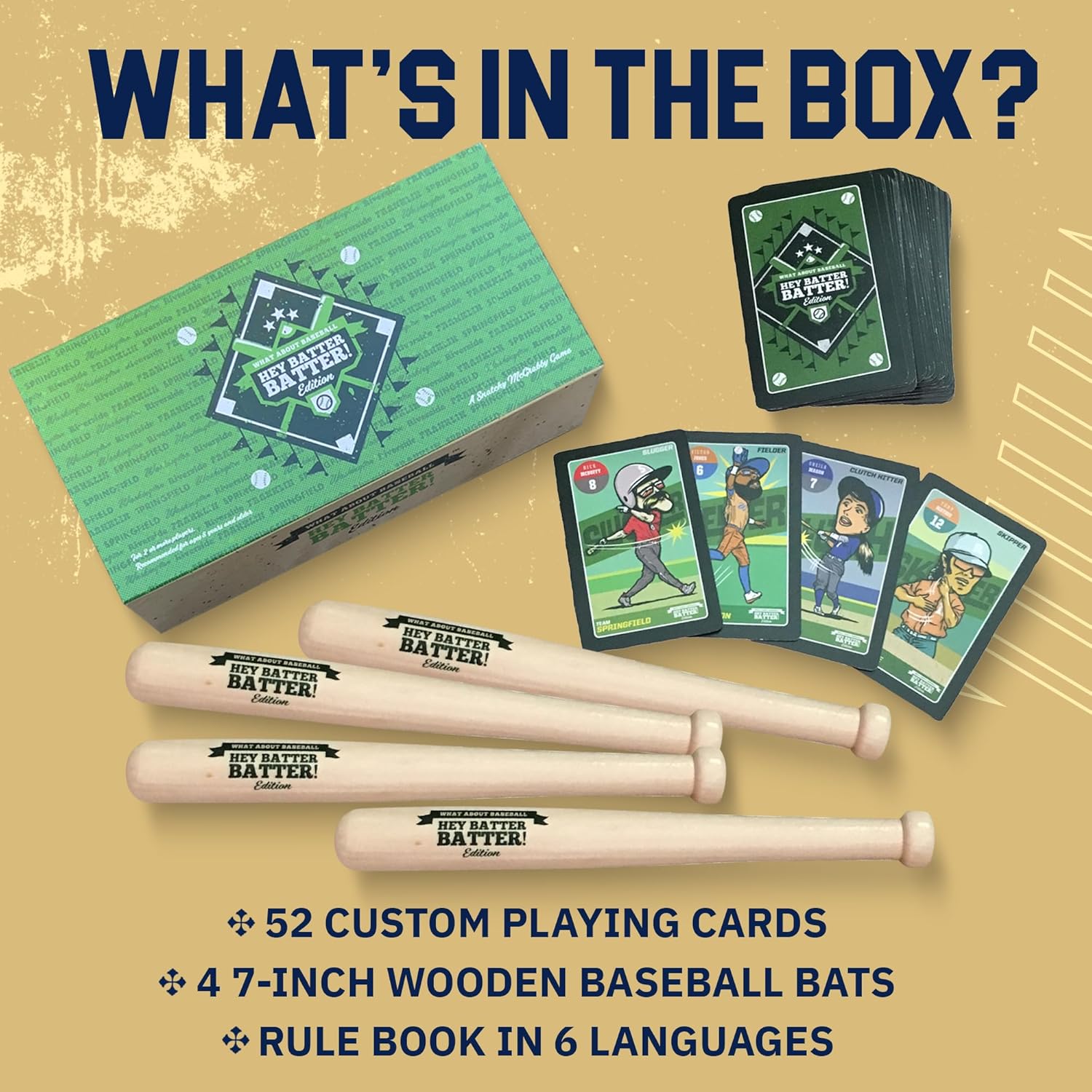 Includes: 52 custom playing cards, (4) 7” wooden baseball bats and full instructions (includes translated versions in Spanish, French, Italian, German and Japanese)
