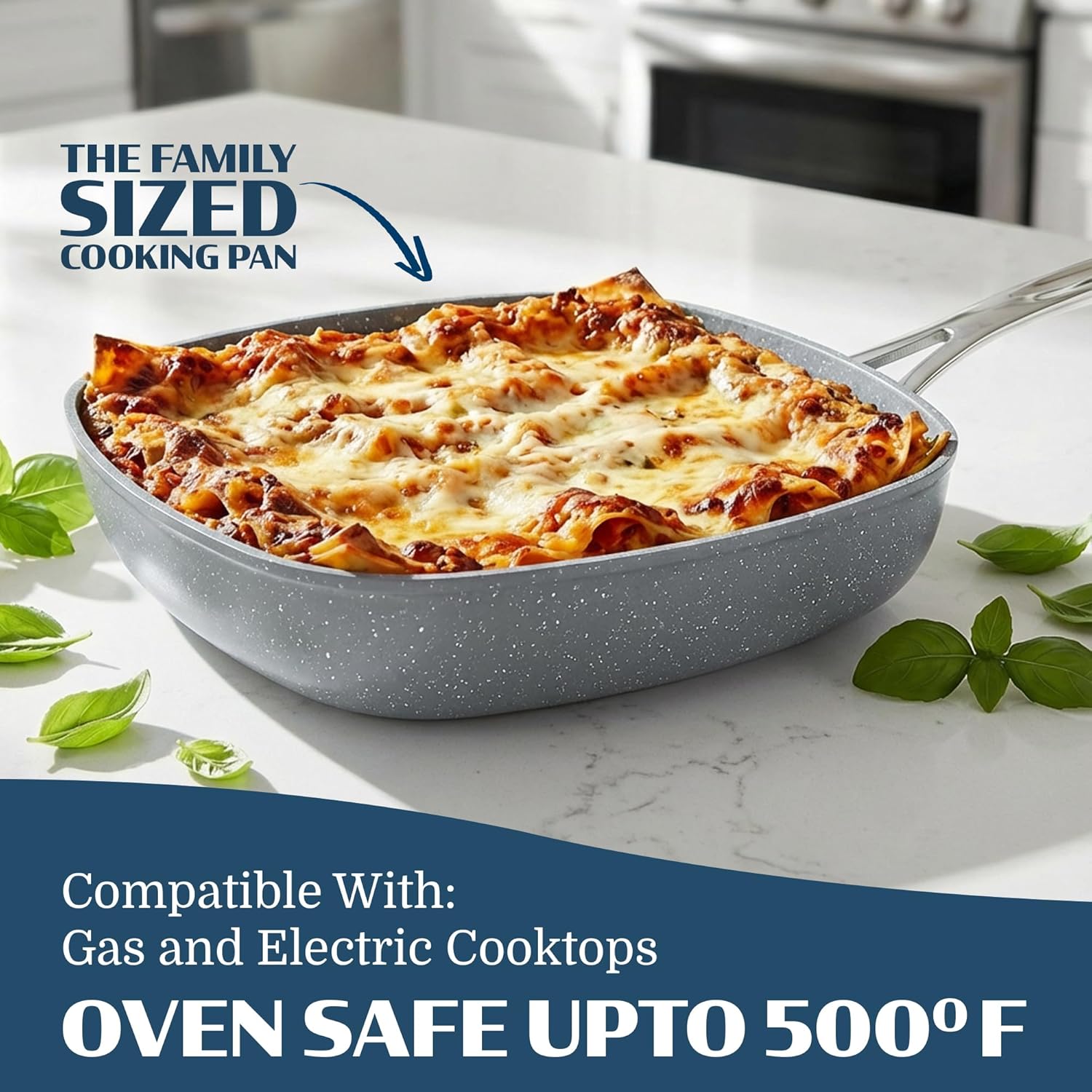 COMPLETE KITCHEN IN A BOX: This kitchen cookware set includes everything you need to start cooking and baking like a pro right out of the box. This set includes- a 8.5″ fry pan, 10.25″ skillet with lid, stainless steel steamer rack, square shallow pan, deep square casserole pan with lid, stainless steel frying basket, steamer insert, XL cookie sheet, square baking pan, loaf pan, round baking pan, and a muffin pan.